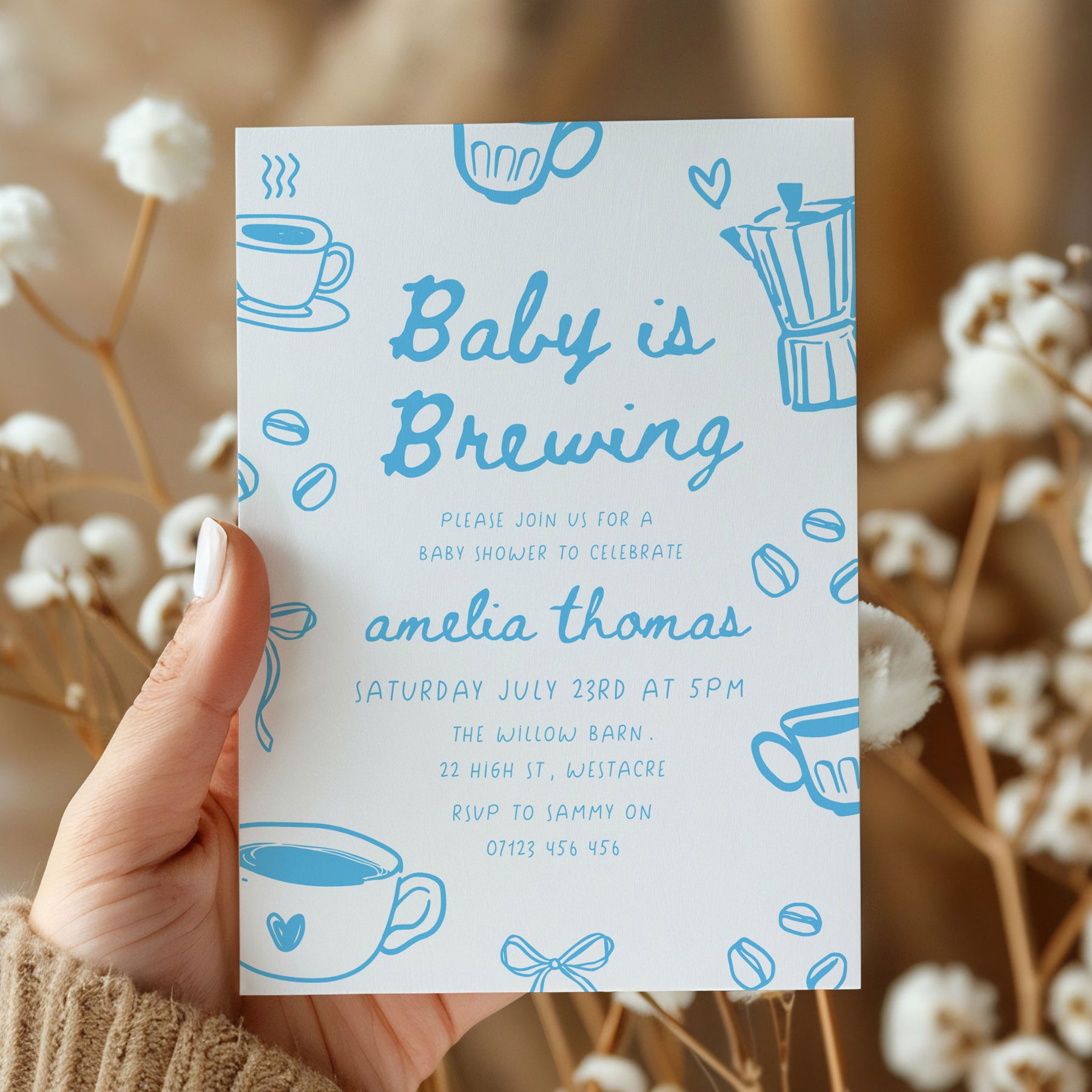 Celebrate the sweetest new arrival with our "A Baby is Brewing" baby shower invitation – a charming, coffee-themed design perfect for modern moms and cozy gatherings! Customise effortlessly and print today, it couldn't be easier.