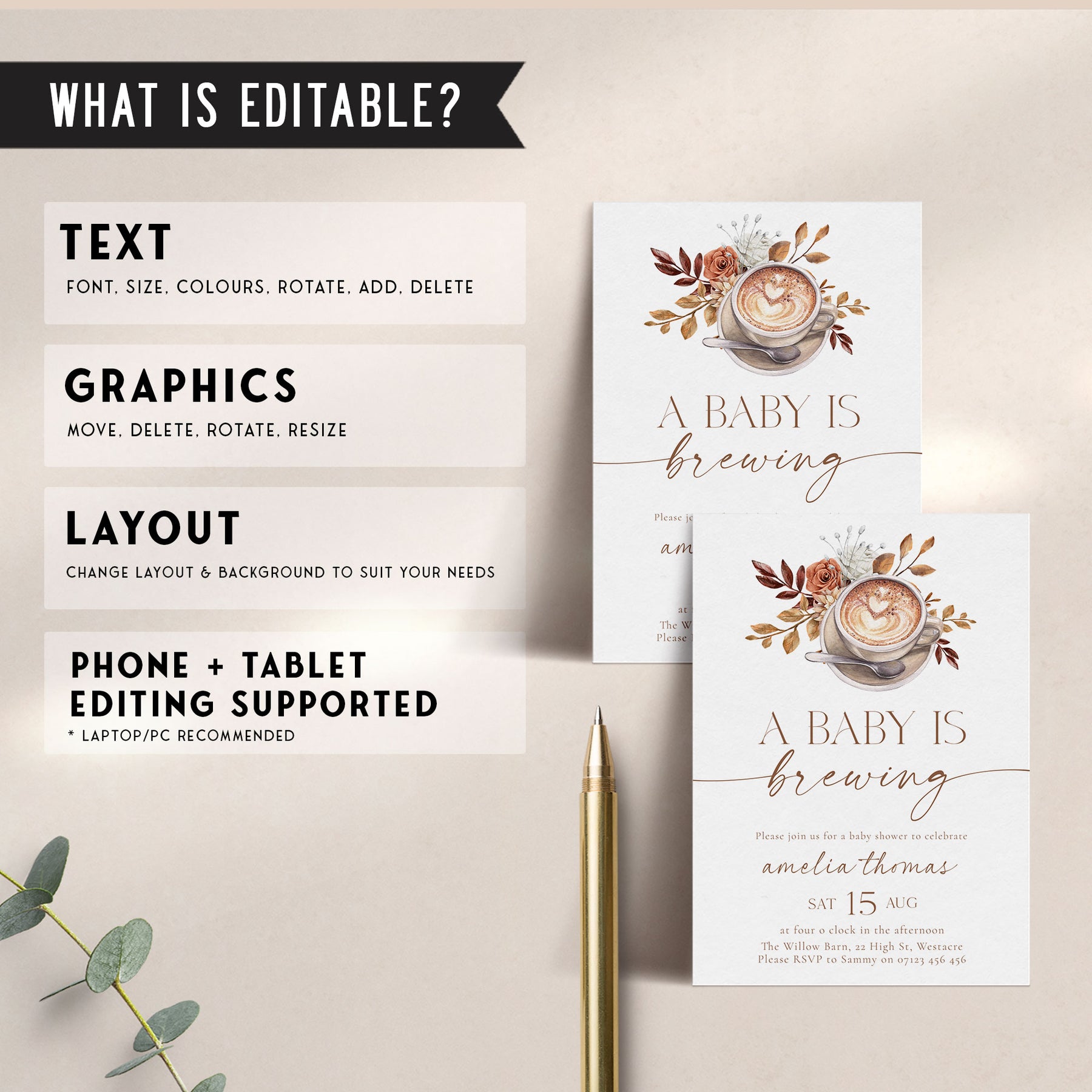 Celebrate the sweetest new arrival with our "A Baby is Brewing" baby shower invitation – a charming, coffee-themed design perfect for modern moms and cozy gatherings! Customise effortlessly and print today, it couldn't be easier.