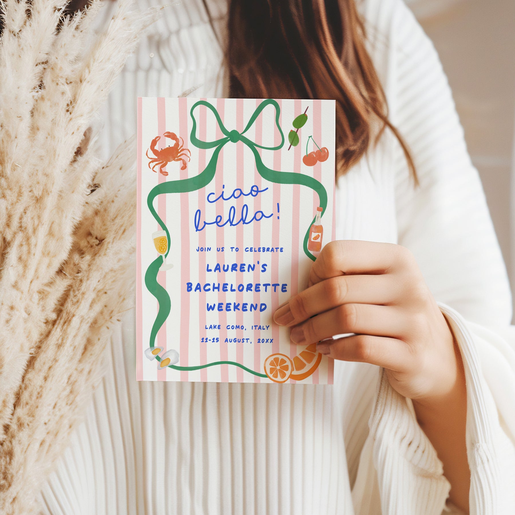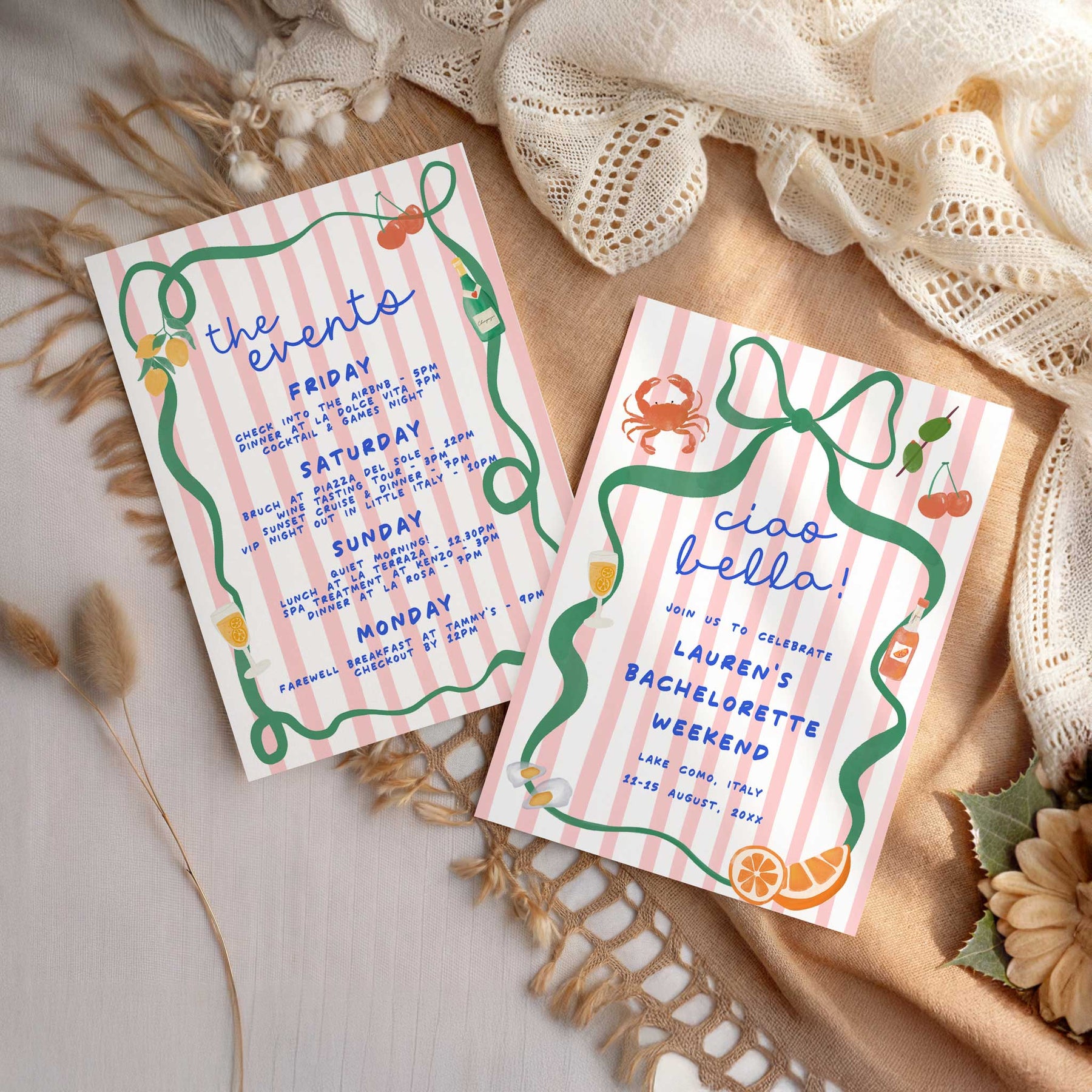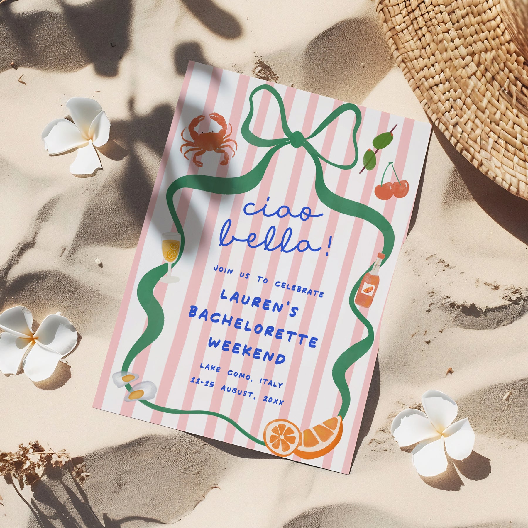 Celebrate your bachelorette party in style with our 'Ciao Bella' bachelorette party invite and itinerary! This editable invitation sets the perfect tone for a your special day. Personalise and send today! It couldn't be easier.
