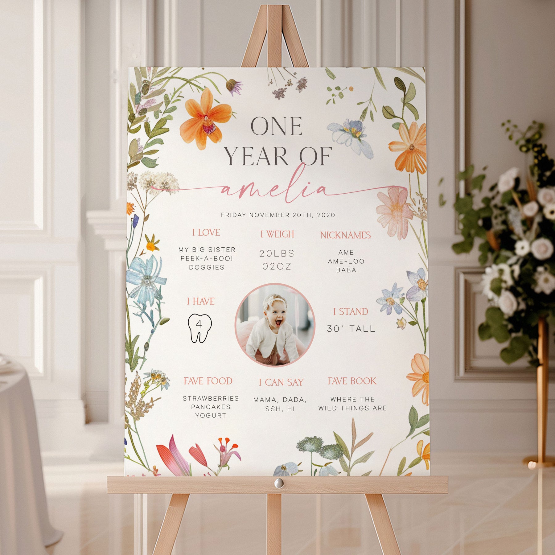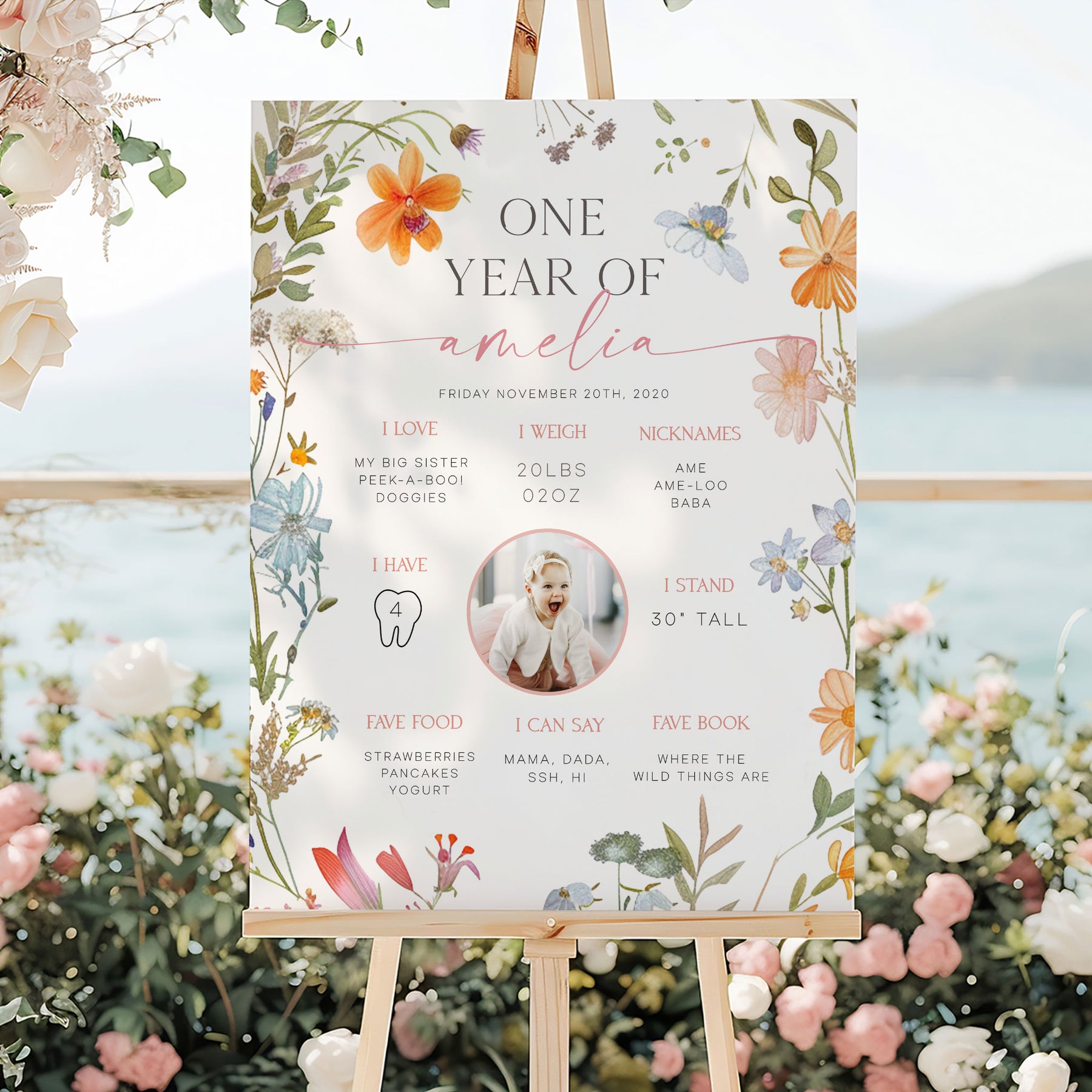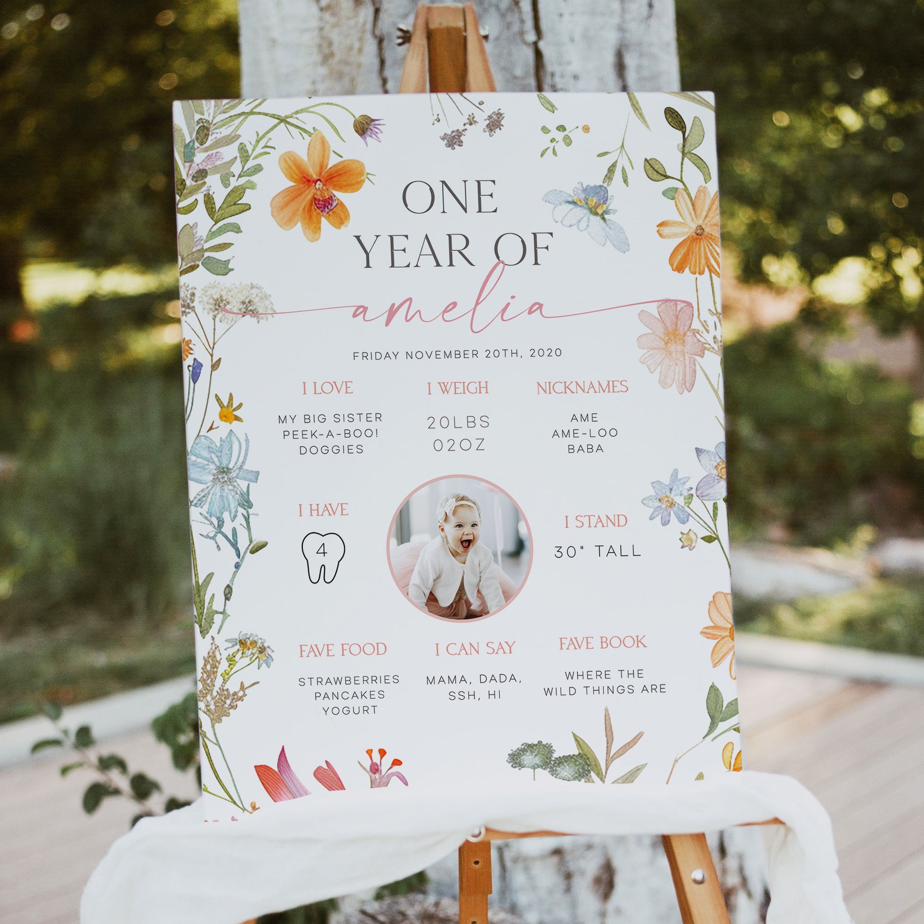 Introducing our One Little Wildflower 1st Birthday stats, the ideal addition to celebrate your little one milestone! This personalised One Little Wildflower Birthday Milestone template captures all the unforgettable moments of your little ones first year. With a charming wildflower floral-themed design, this editable template allows you to customise the stats and details, making it a unique keepsake. Displaying your little one's growth, from their first steps to their favourite team, this poster serves as a delightful centrepiece for your little ones birthday party.