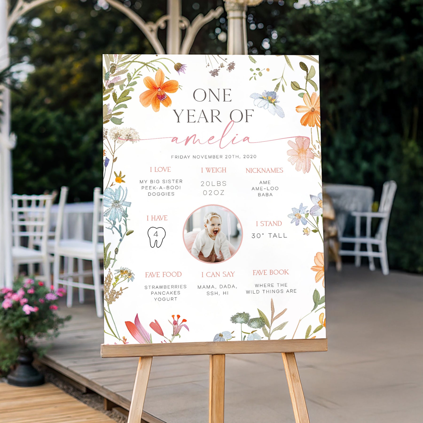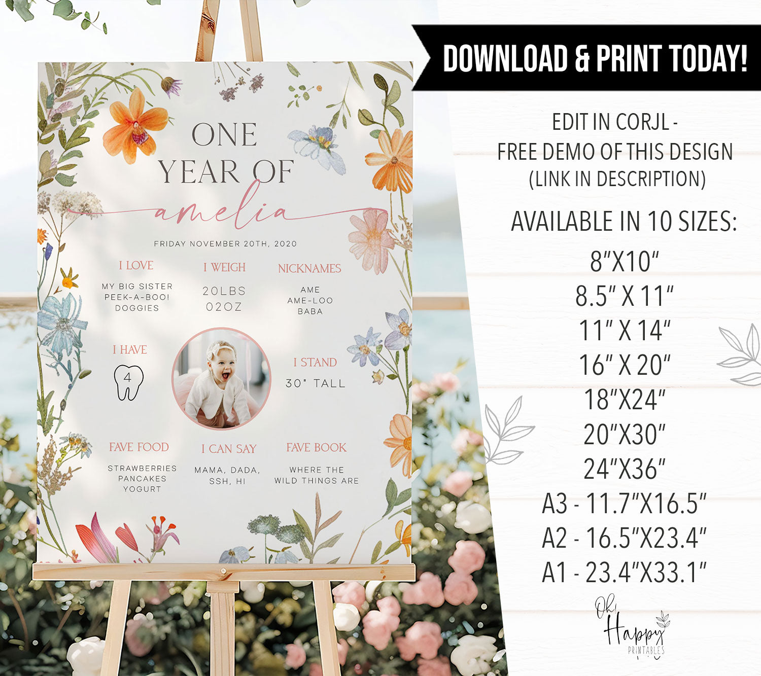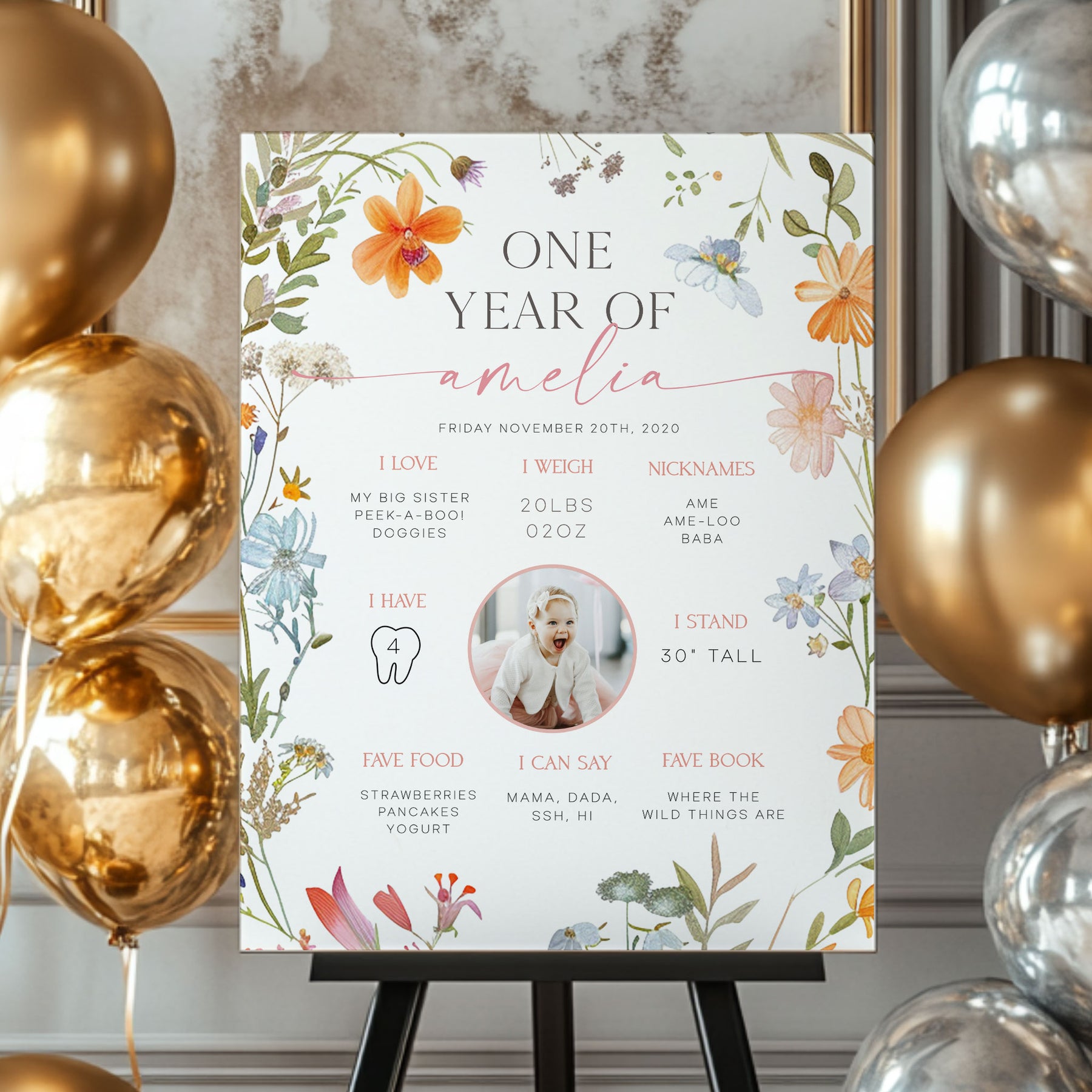 Introducing our One Little Wildflower 1st Birthday stats, the ideal addition to celebrate your little one milestone! This personalised One Little Wildflower Birthday Milestone template captures all the unforgettable moments of your little ones first year. With a charming wildflower floral-themed design, this editable template allows you to customise the stats and details, making it a unique keepsake. Displaying your little one's growth, from their first steps to their favourite team, this poster serves as a delightful centrepiece for your little ones birthday party.