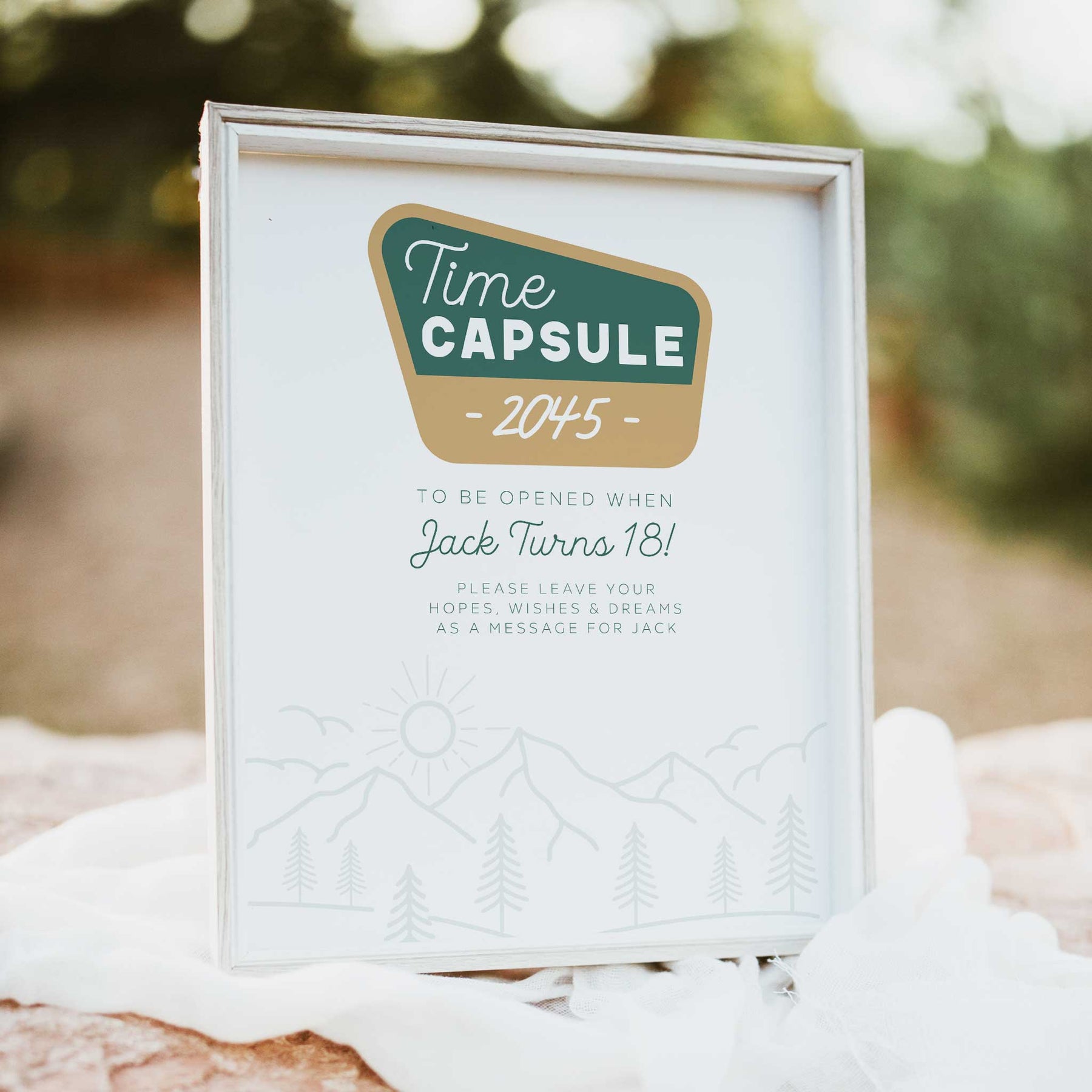 Introducing our One Happy Camper 1st Birthday Time Capsule, the ideal addition to celebrate your little one milestone! This personalised One Happy Camper time Capsule captures all the wishes, wants, and personalised moments for your little one to open when they turn 18. With a adventure-themed design, this editable template allows you to customise, making it a unique keepsake.