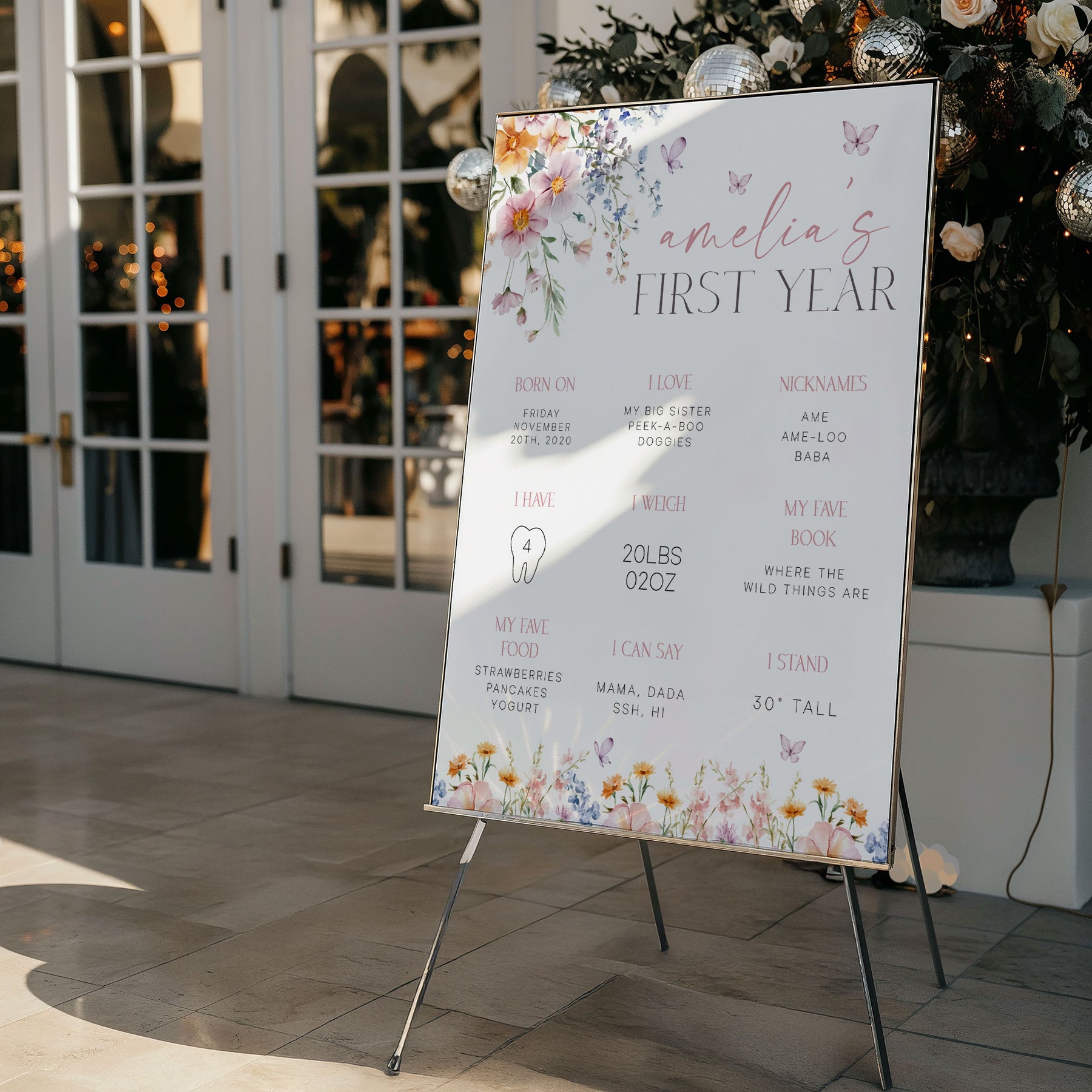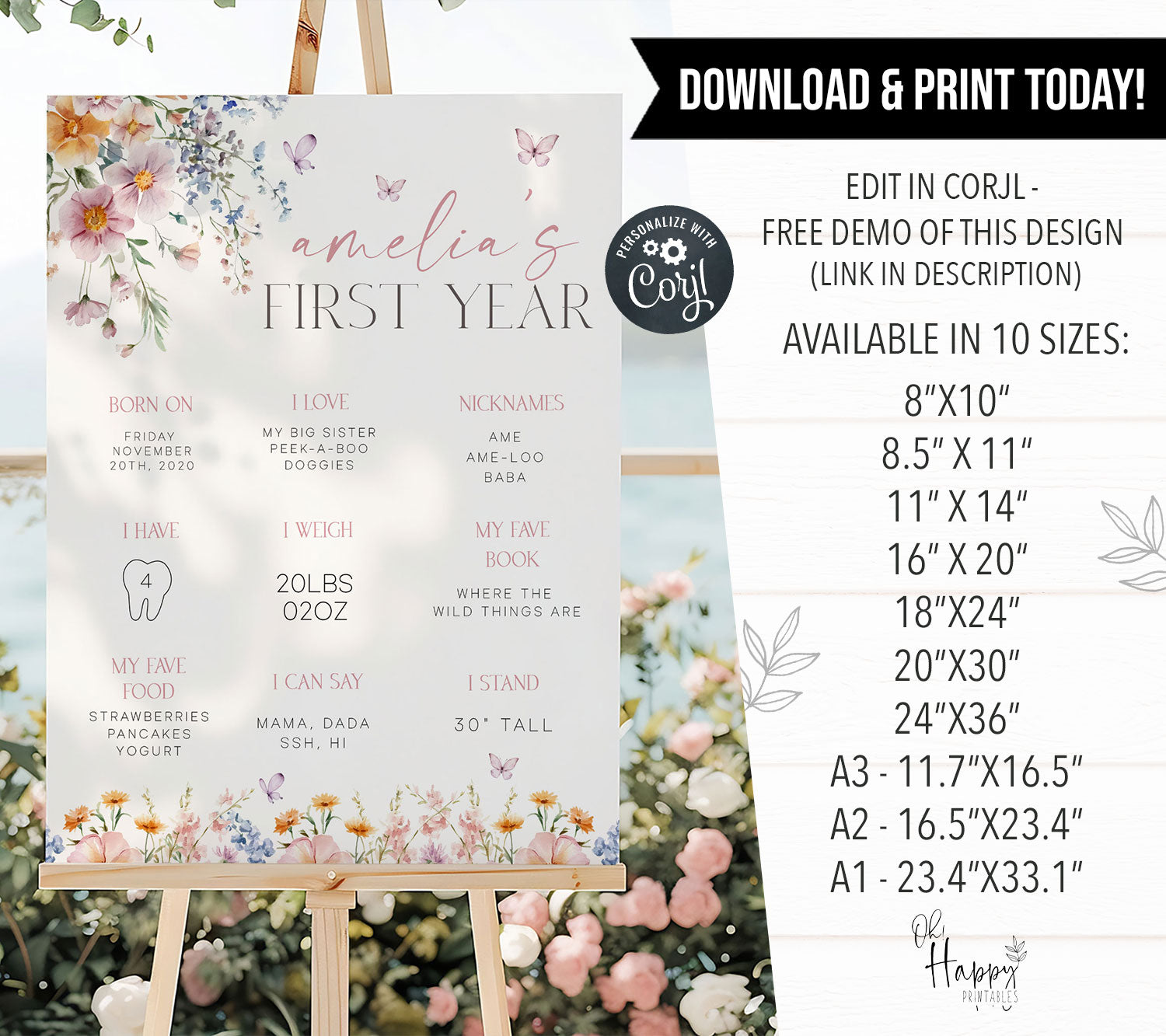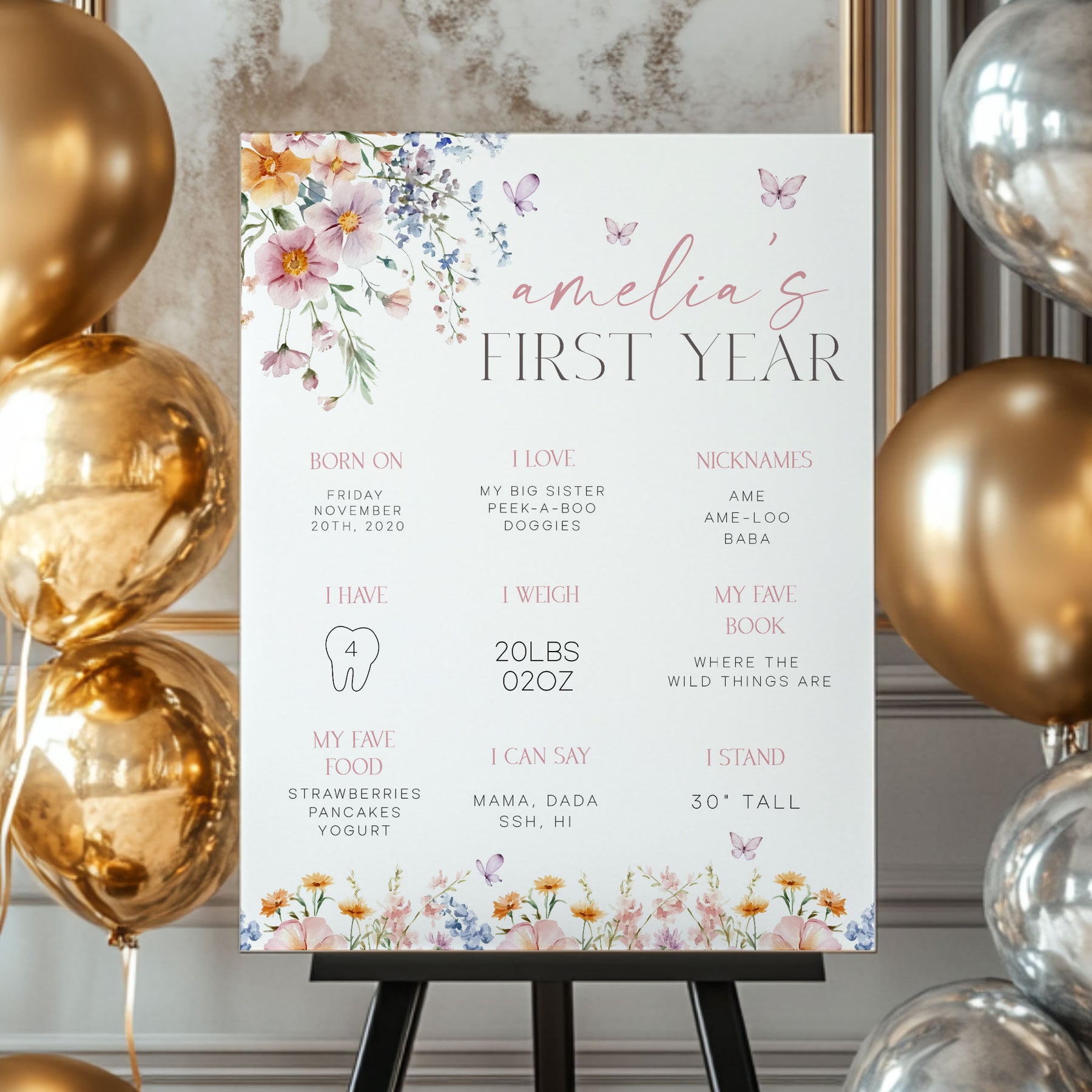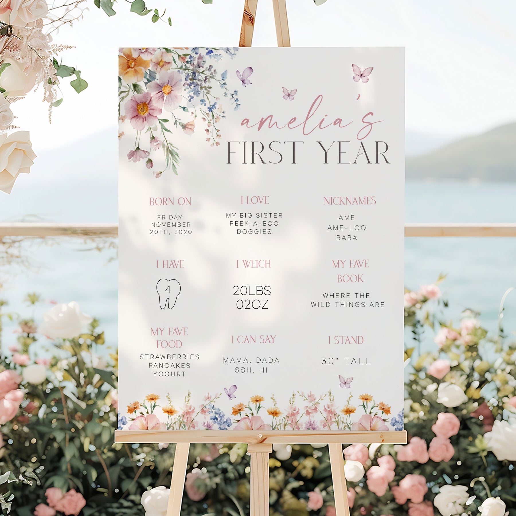 Introducing our One Little Wildflower 1st Birthday stats, the ideal addition to celebrate your little one milestone! This personalised One Little Wildflower Birthday Milestone template captures all the unforgettable moments of your little ones first year. With a charming wildflower floral-themed design, this editable template allows you to customise the stats and details, making it a unique keepsake. Displaying your little one's growth, from their first steps to their favourite team, this poster serves as a delightful centrepiece for your little ones birthday party.
