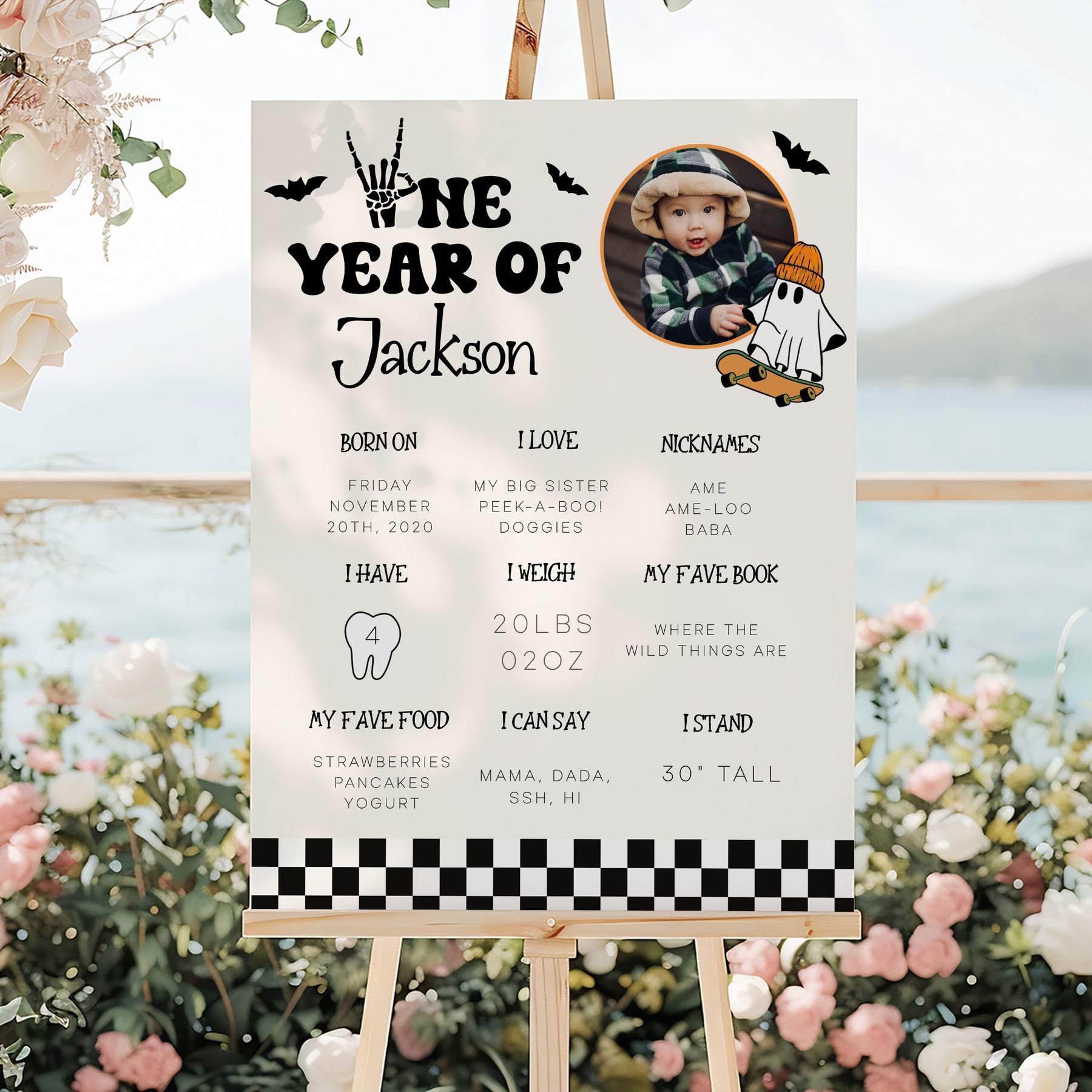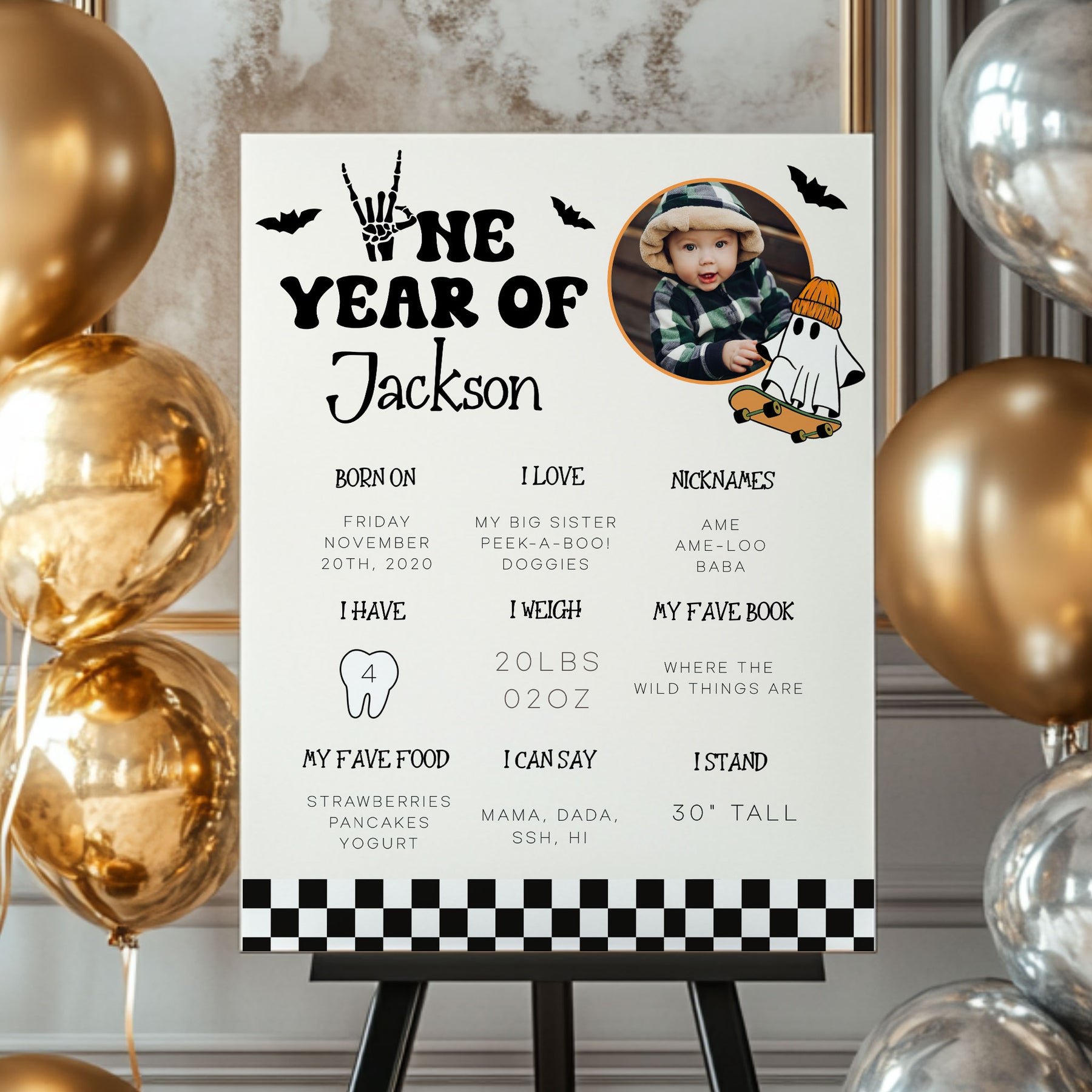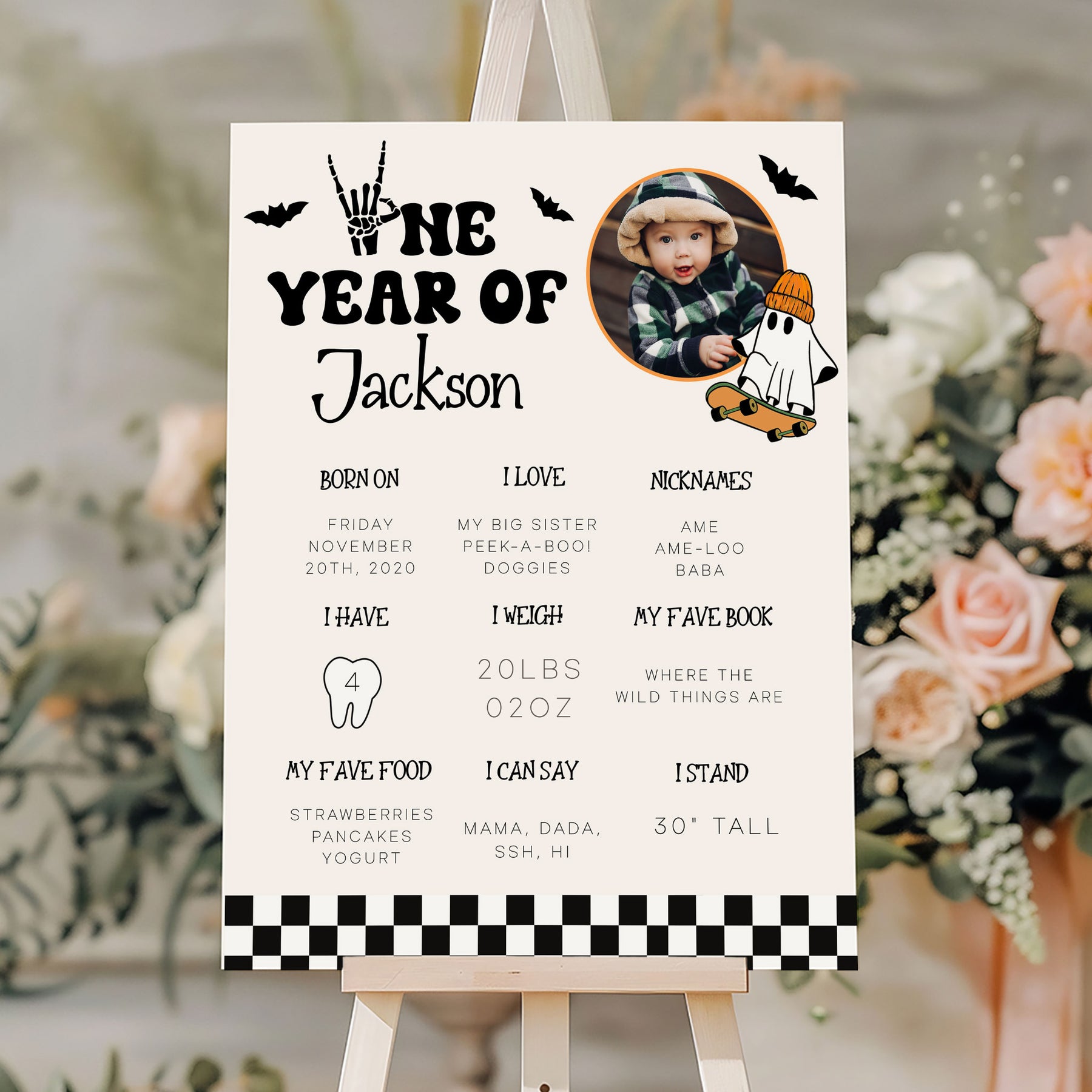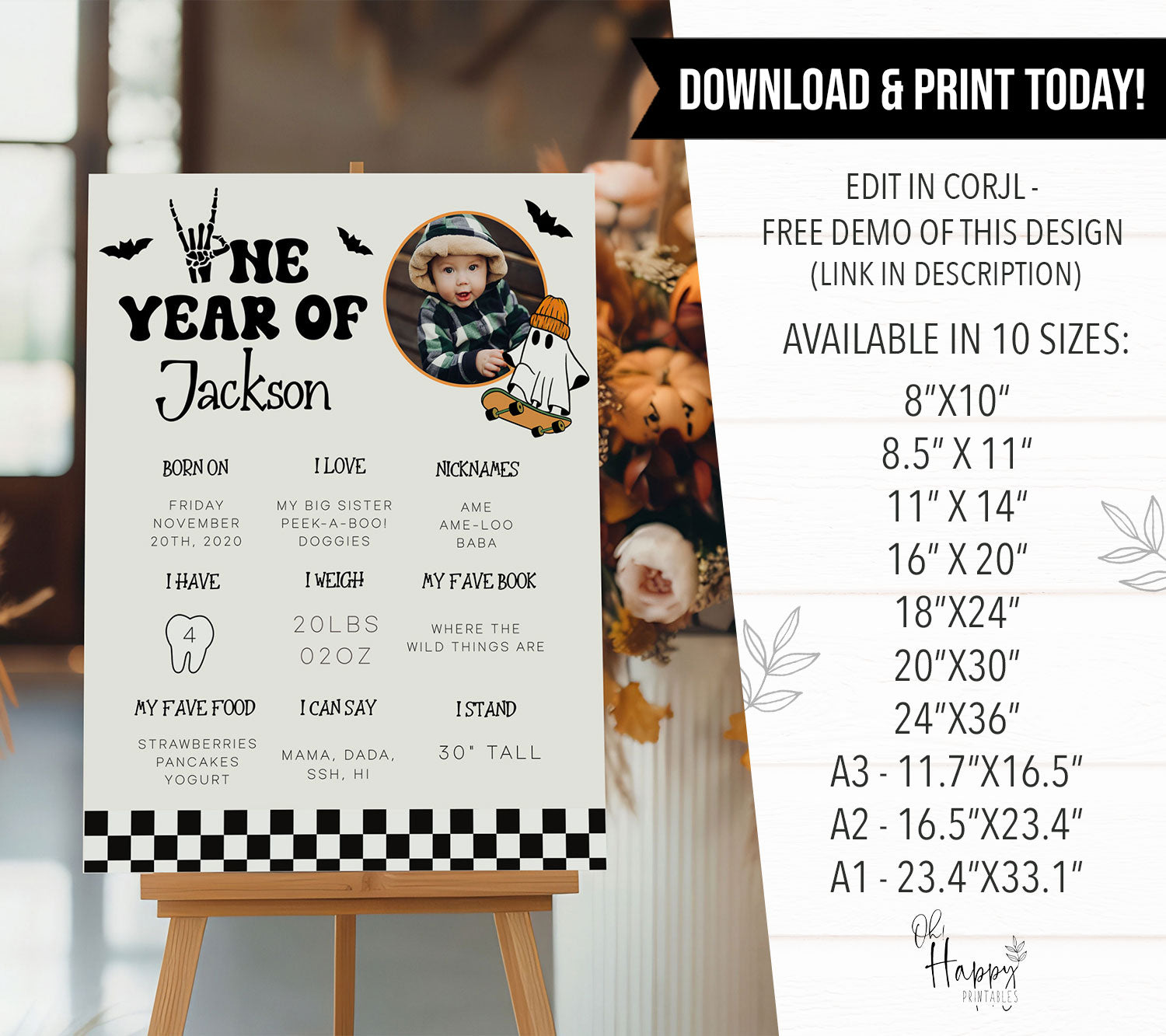Introducing our One Spooky Dude 1st Birthday stats, the ideal addition to celebrate your little one milestone! This personalised One Spooky Dude Birthday Milestone template captures all the unforgettable moments of your little ones first year. With a friendly spooky skateboard-themed design, this editable template allows you to customise the stats and details, making it a unique keepsake. Displaying your little one's growth, from their first steps to their favourite book, this poster serves as a delightful centrepiece for your little ones birthday party.