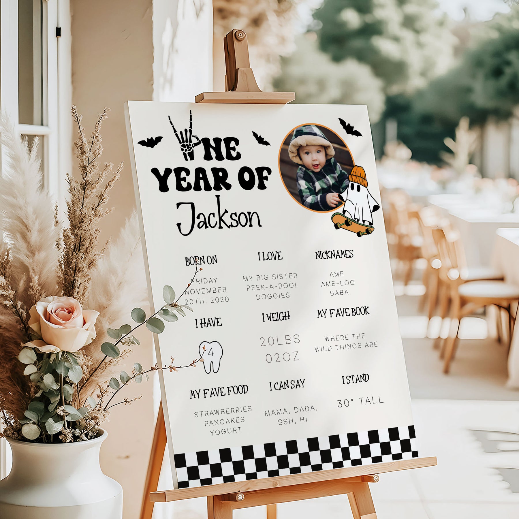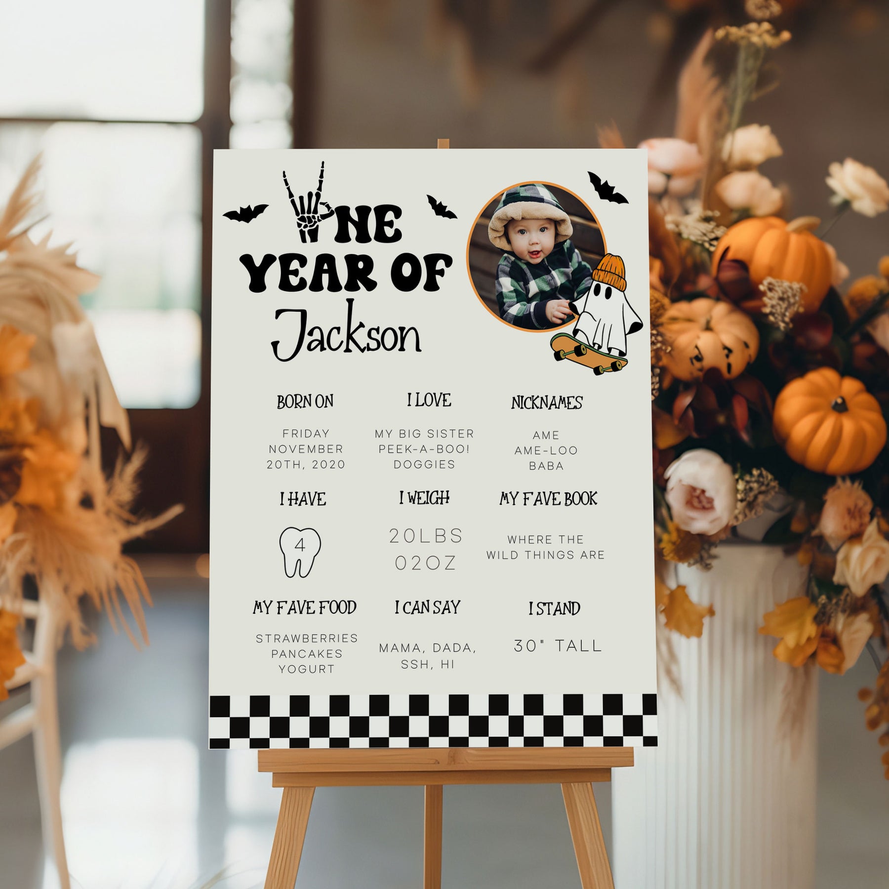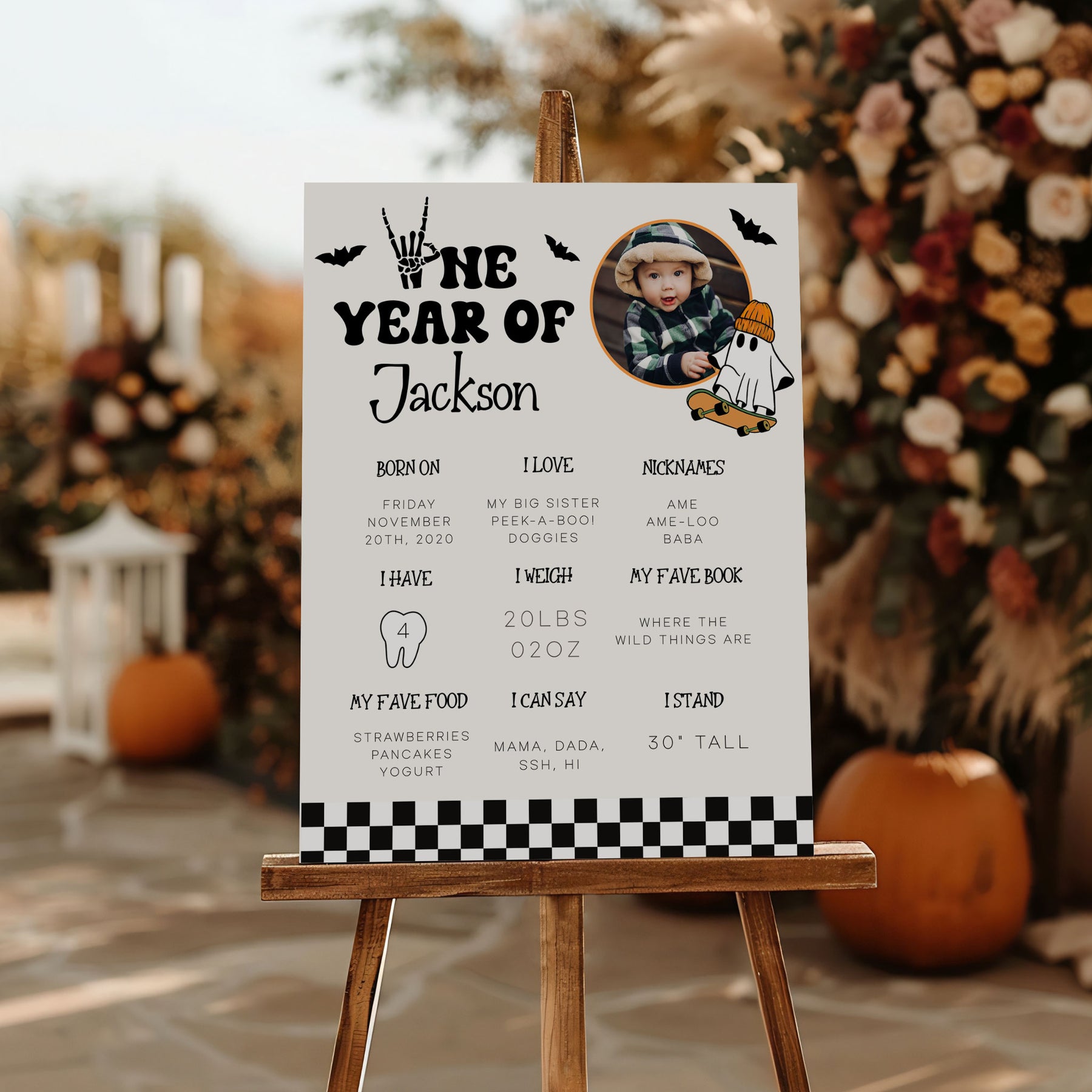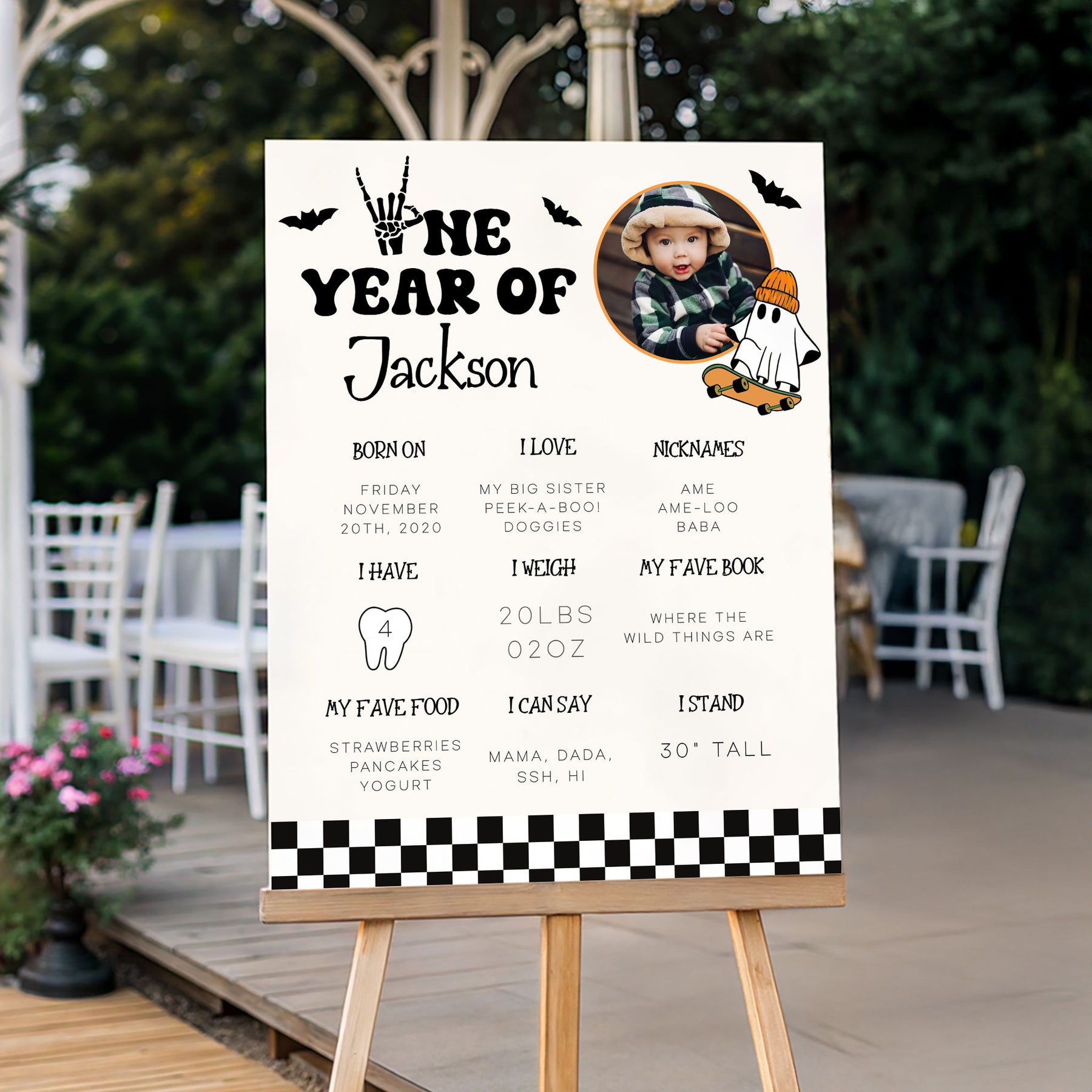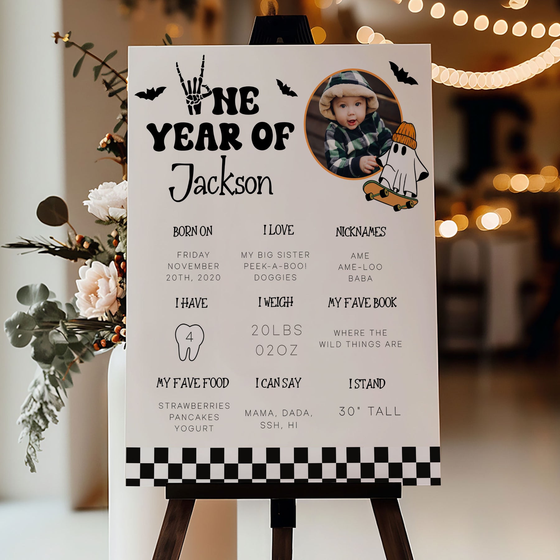 Introducing our One Spooky Dude 1st Birthday stats, the ideal addition to celebrate your little one milestone! This personalised One Spooky Dude Birthday Milestone template captures all the unforgettable moments of your little ones first year. With a friendly spooky skateboard-themed design, this editable template allows you to customise the stats and details, making it a unique keepsake. Displaying your little one's growth, from their first steps to their favourite book, this poster serves as a delightful centrepiece for your little ones birthday party.