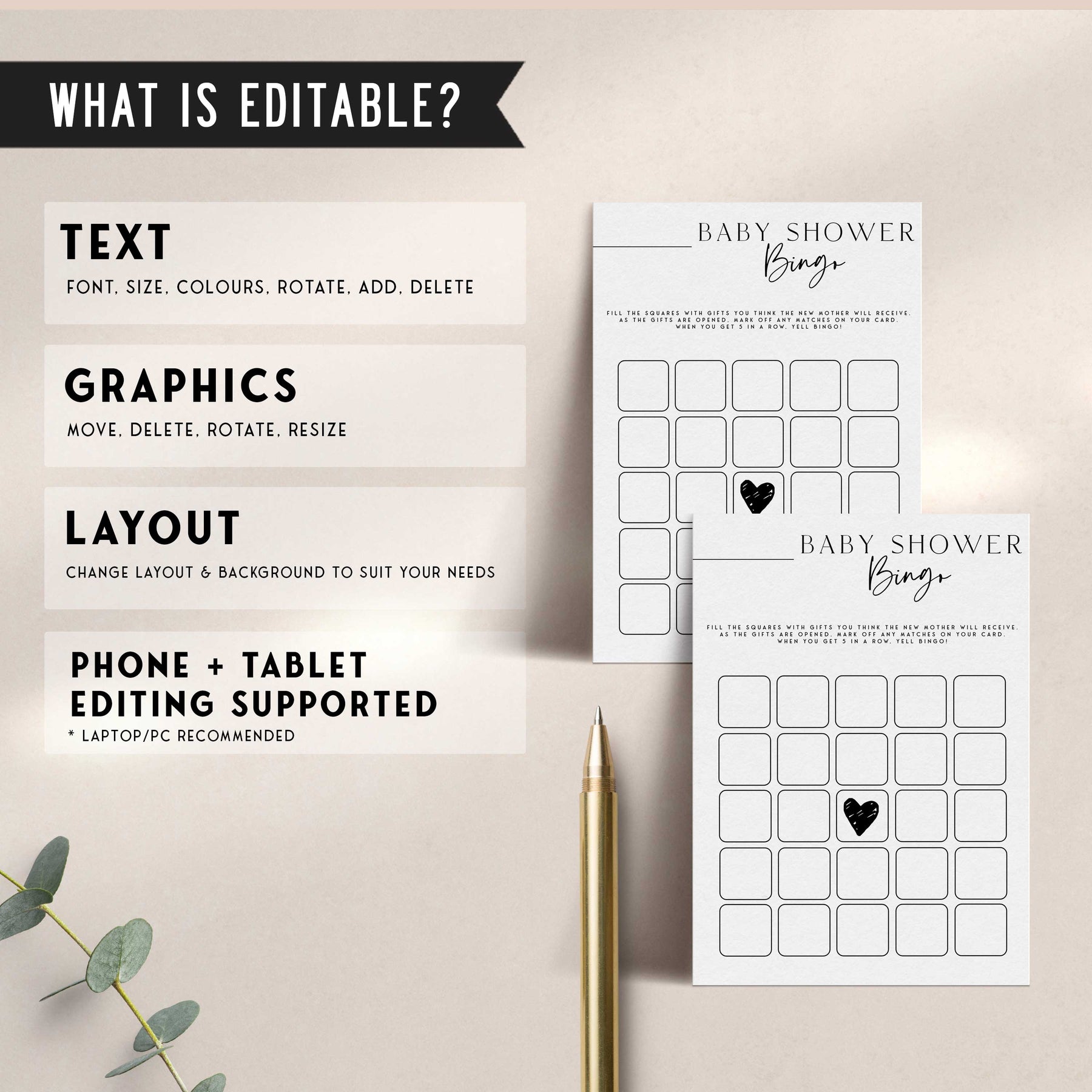 baby shower bingo game, baby shower game, printable baby shower games, editable baby shower games, modern baby shower games, minimalist baby shower