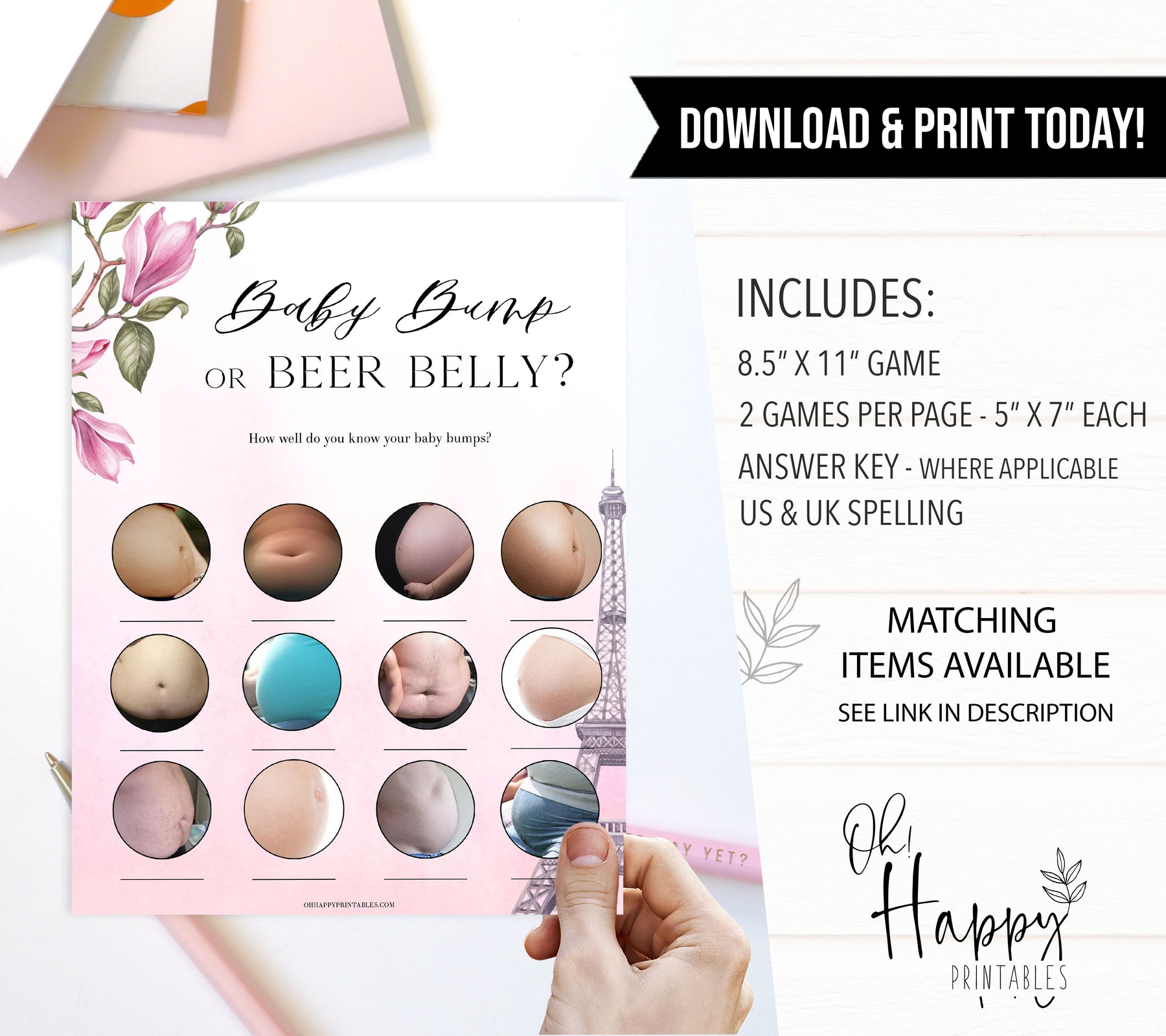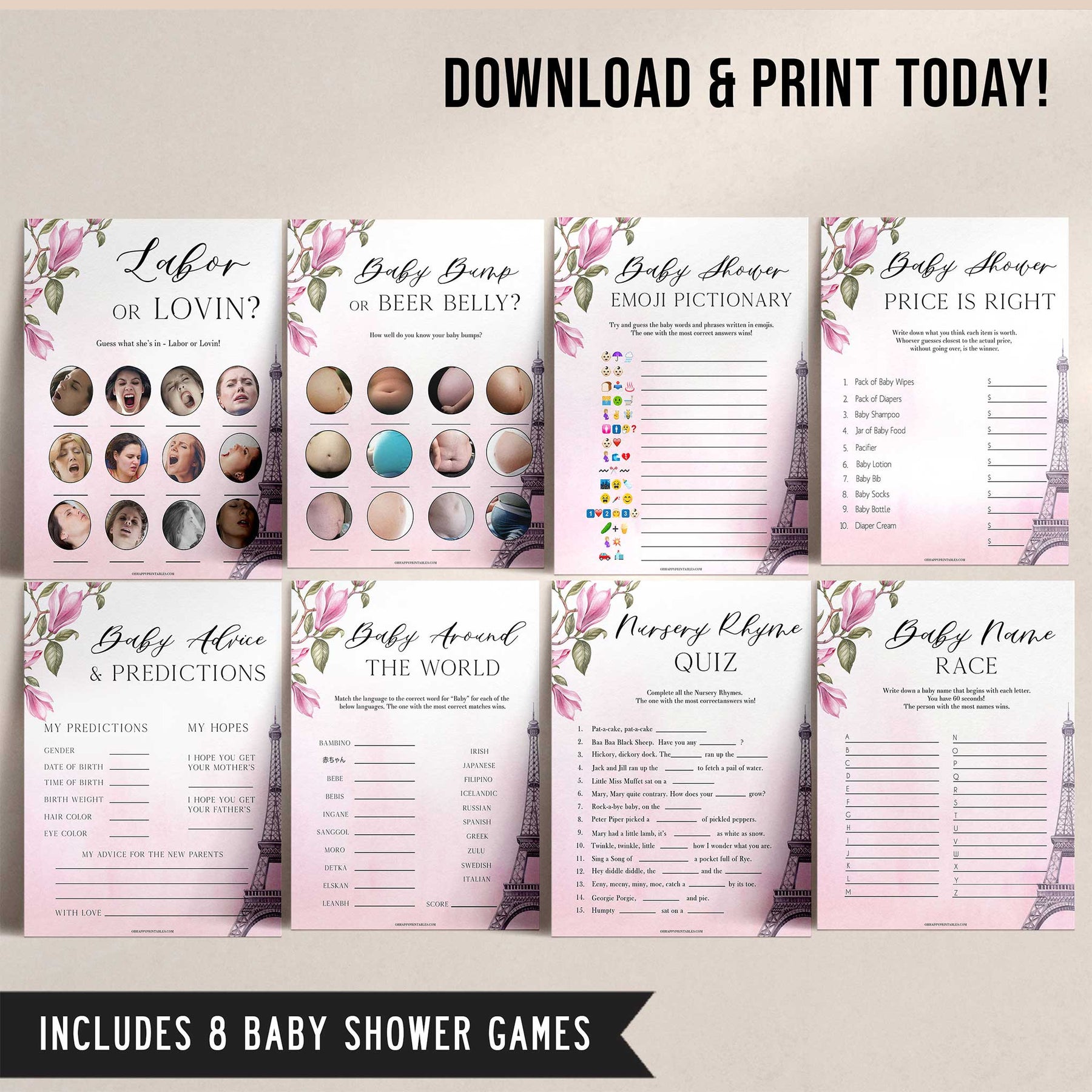 Get all your baby shower party games in one place with this gorgeous baby shower games pack. Featuring 8 of our most popular games, all you need to do is download and print at home.