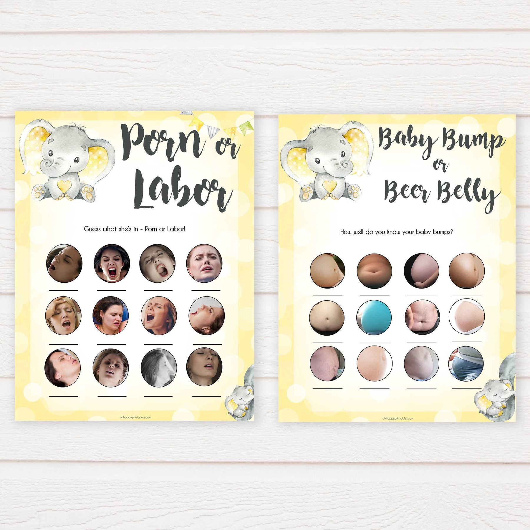 yellow elephant baby games, 10 baby game bundle, baby shower games, baby game bundles, fun baby games, top baby games, labor or porn, baby bump game, instant download games