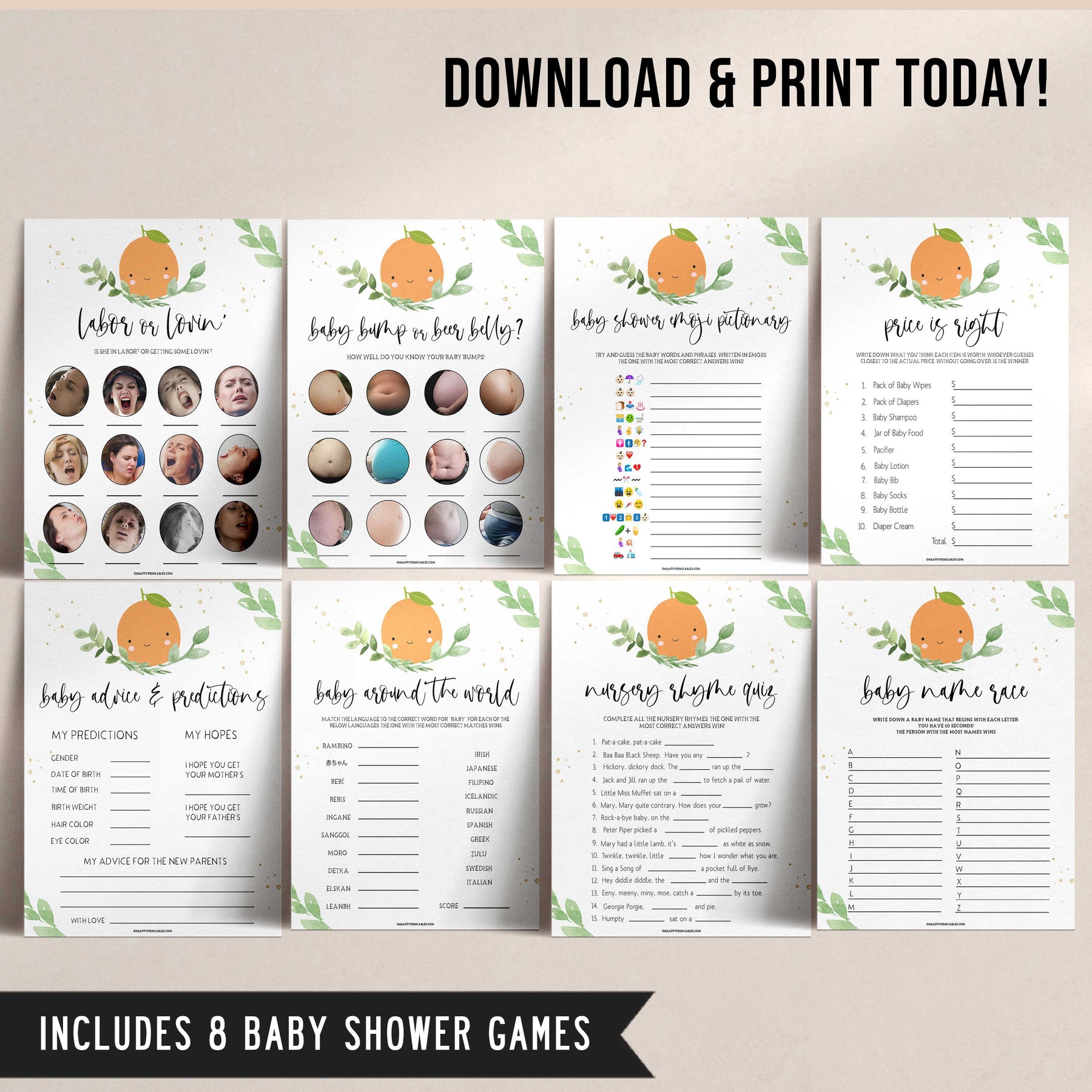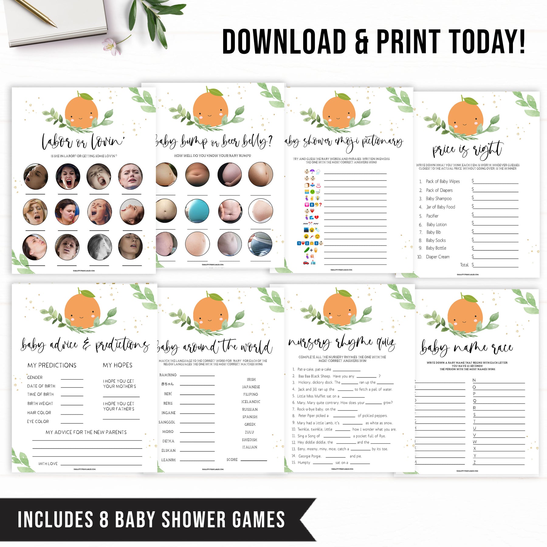 Get all your baby shower party games in one place with this gorgeous baby shower games pack. Featuring 10 of our most popular games, all you need to do is download and print at home.