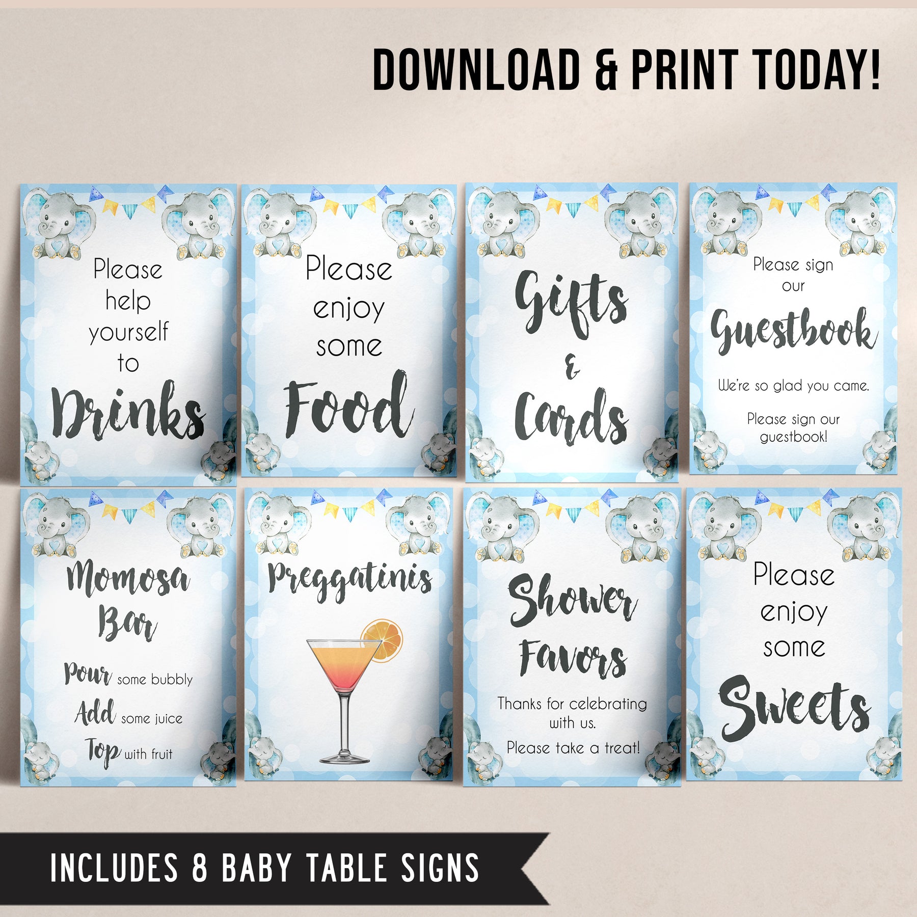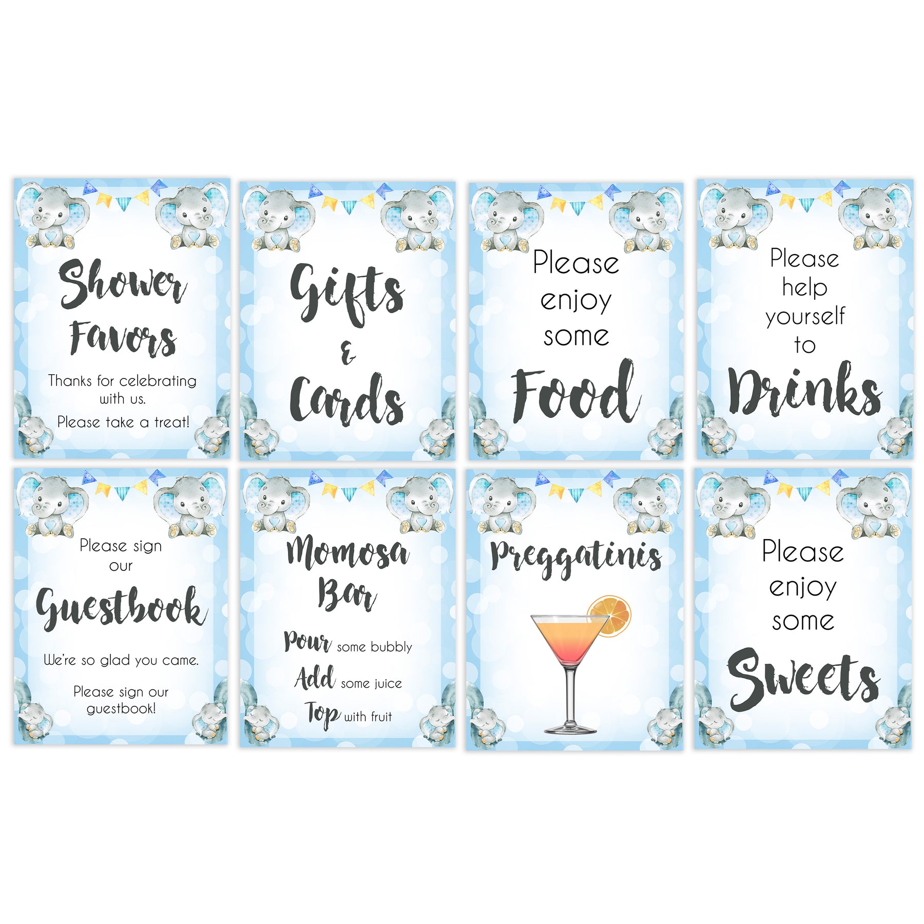 8 baby shower signs, 8 baby shower table signs, Blue elephant baby decor, printable baby table signs, printable baby decor, blue table signs, fun baby signs, fun baby table signs