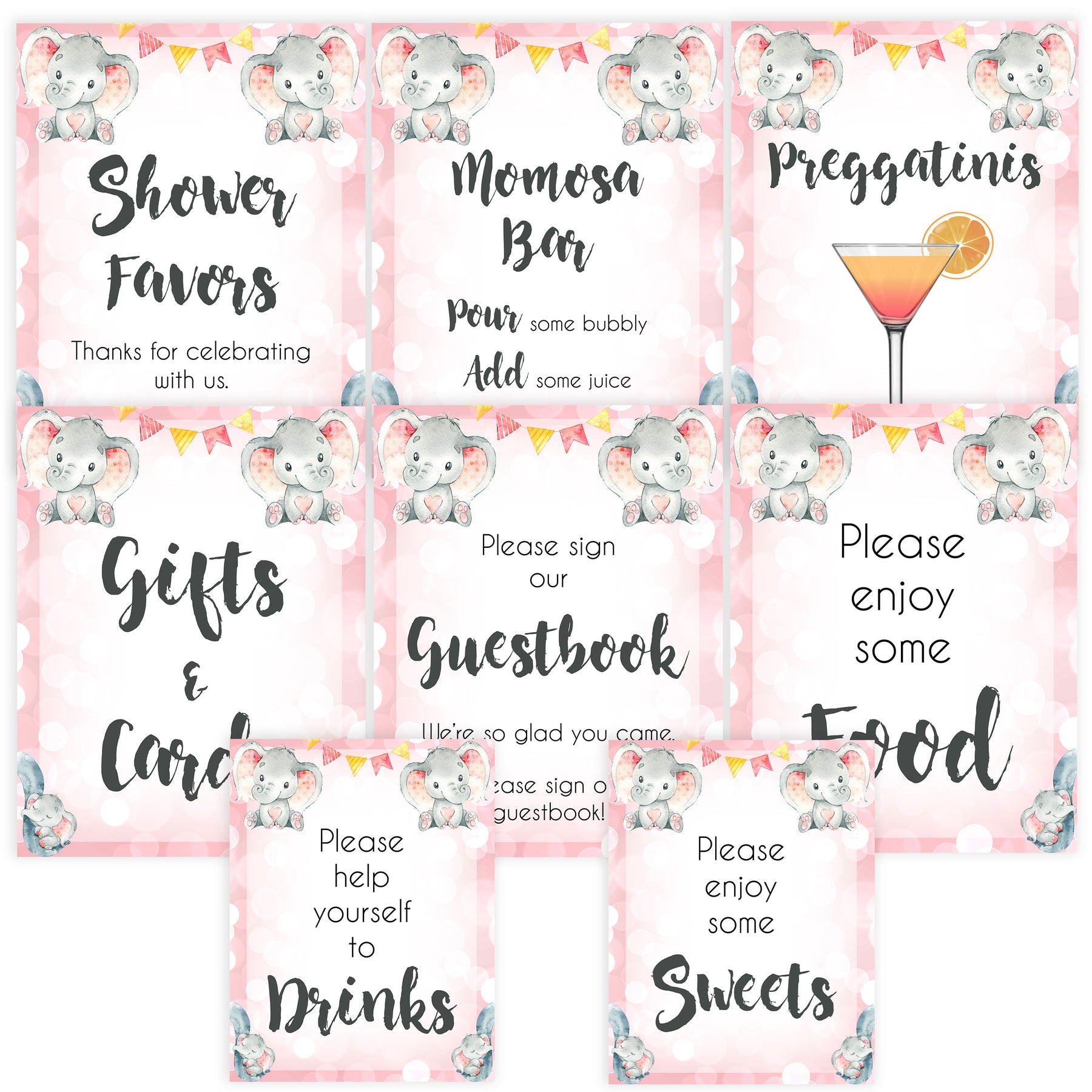 8 baby table sings, baby table signs pack, Pink elephant baby decor, printable baby table signs, printable baby decor, pink table signs, fun baby signs, fun baby table signs