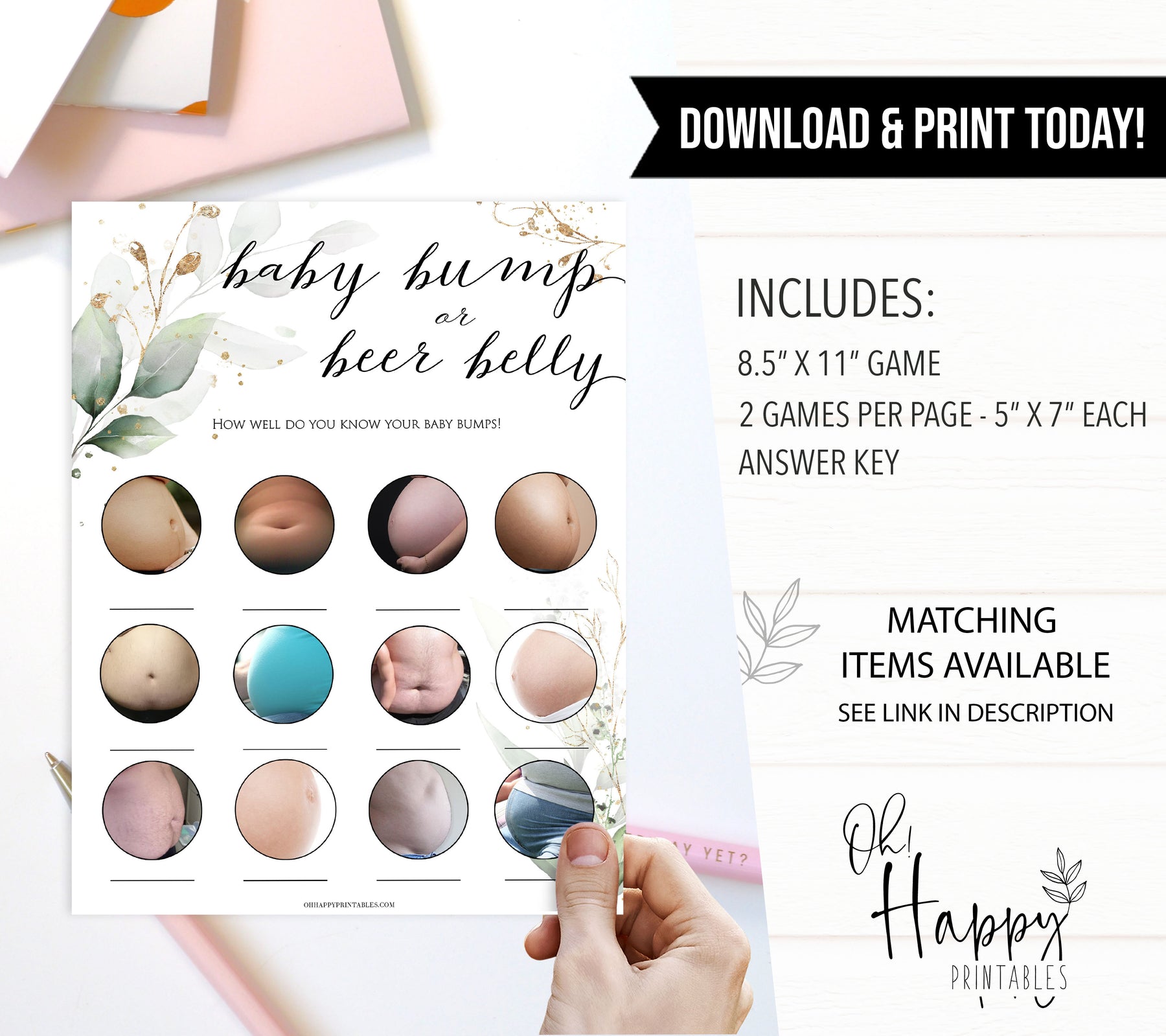 Gold green leaf baby games, baby bump or beer belly, printable baby games, fun baby games, top baby games to play, gold leaf baby shower, greenery baby shower ideas