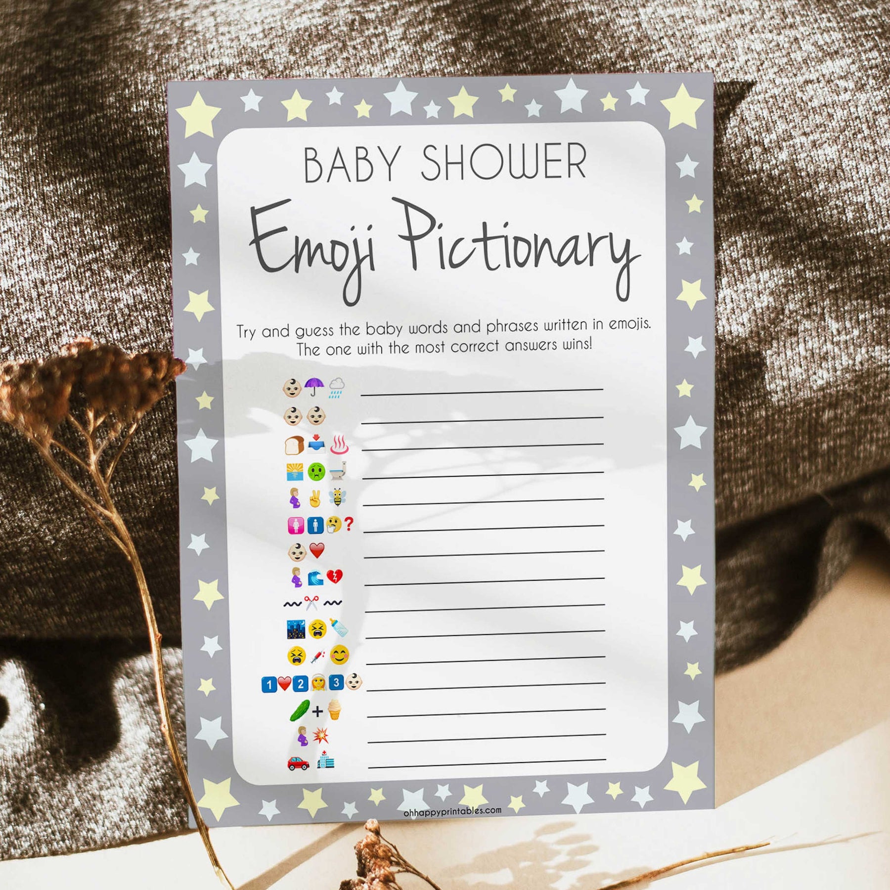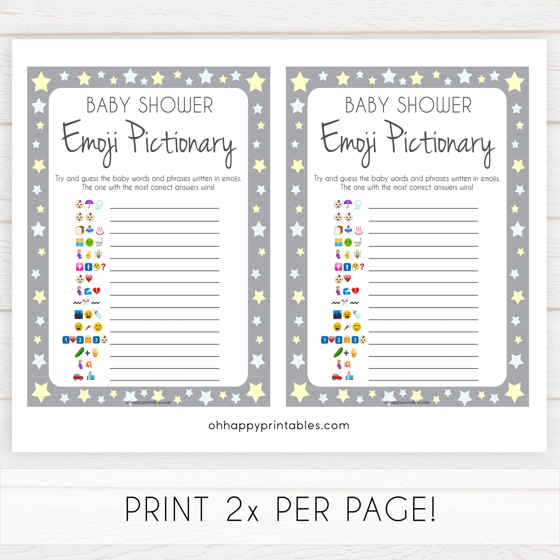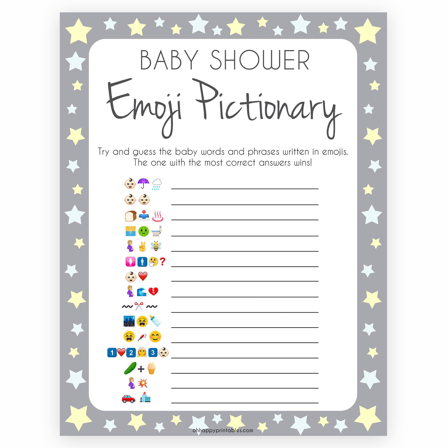 Grey Yellow Stars Emoji Pictionary Baby Shower Games, Printable Baby Shower Games, Emoji Pictionary, Stars Baby Shower Games. Emoji Game, fun abby shower games, popular baby shower games