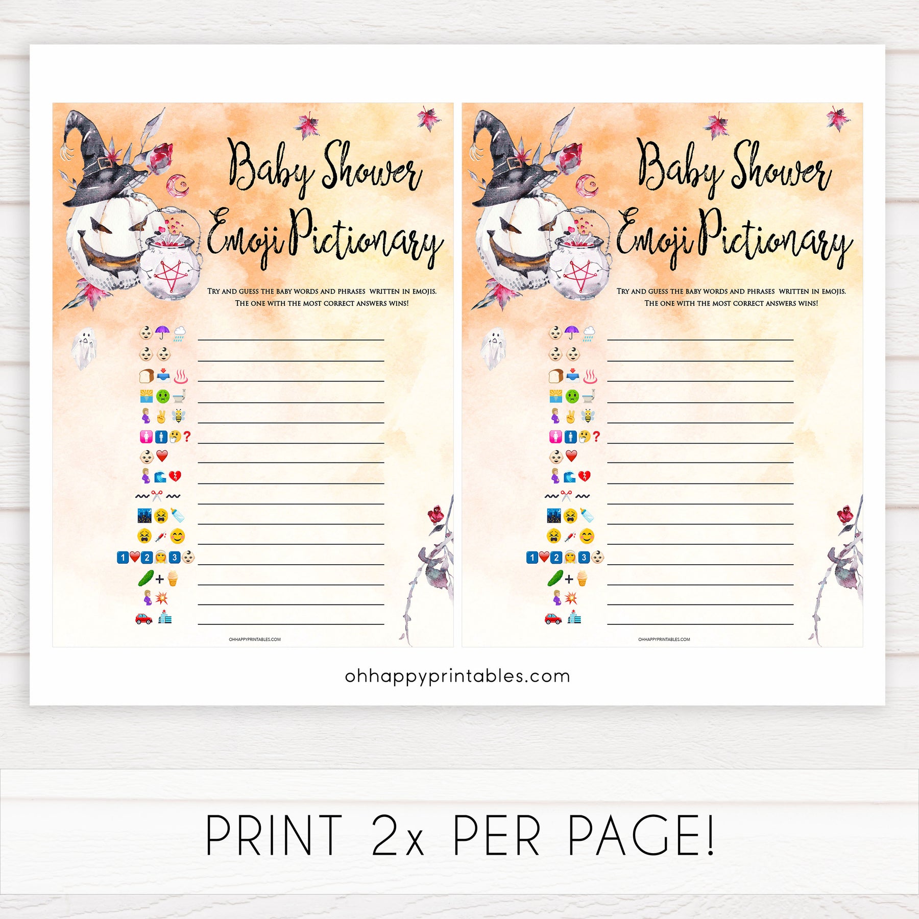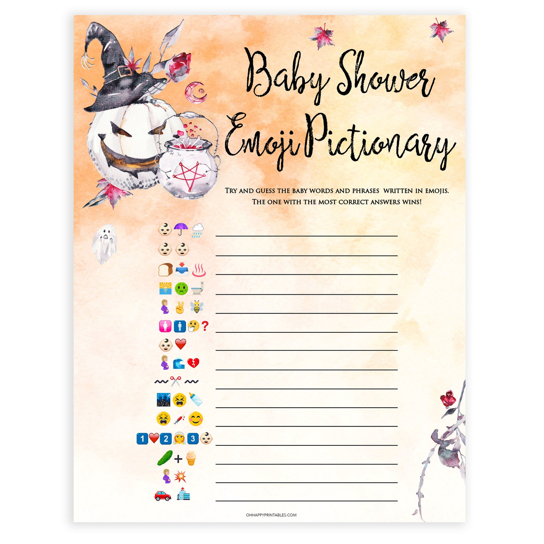 A hilarious baby shower game that's great for new parents who like to have a bit of fun! Have your friends guess the words made up of emojis. This printable game comes with an answer key, and is available in two sizes. Download instantly and print at home for some baby shower fun.