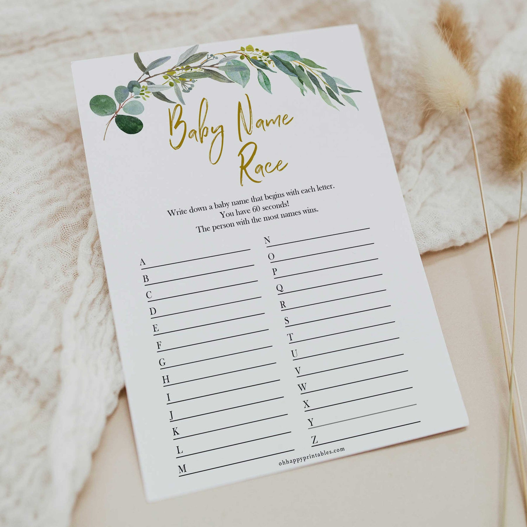Eucalyptus baby shower games, baby name race baby game, fun baby shower games, printable baby games, baby shower ideas, baby games, baby shower baby shower bundle, baby shower games packs, botanical baby shower