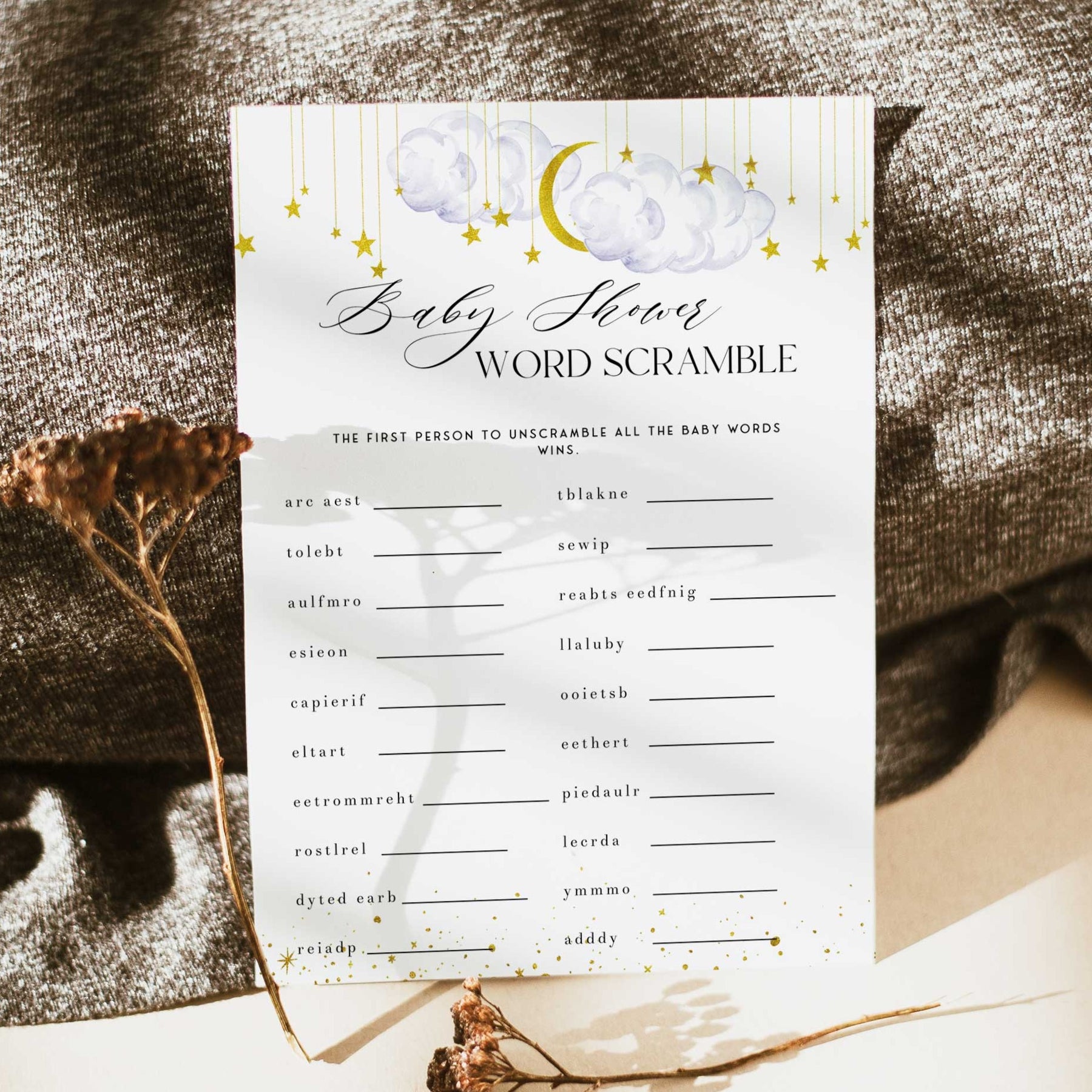 Fully editable and printable baby shower baby word scramble game with a little star design. Perfect for a Twinkle Little Star baby shower themed party