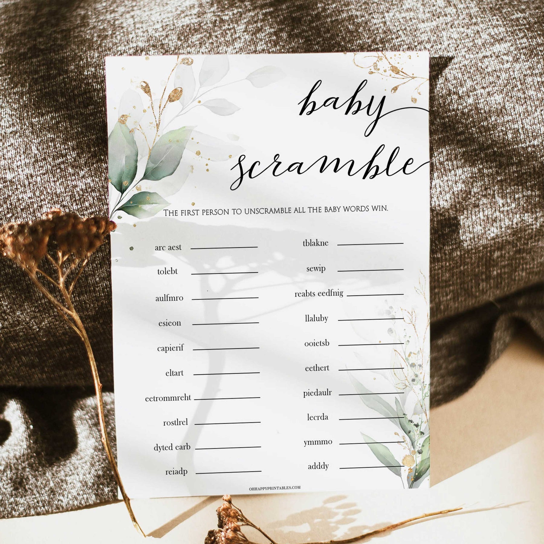 Gold green leaf baby games, baby scramble game, printable baby games, fun baby games, top baby games to play, gold leaf baby shower, greenery baby shower ideas