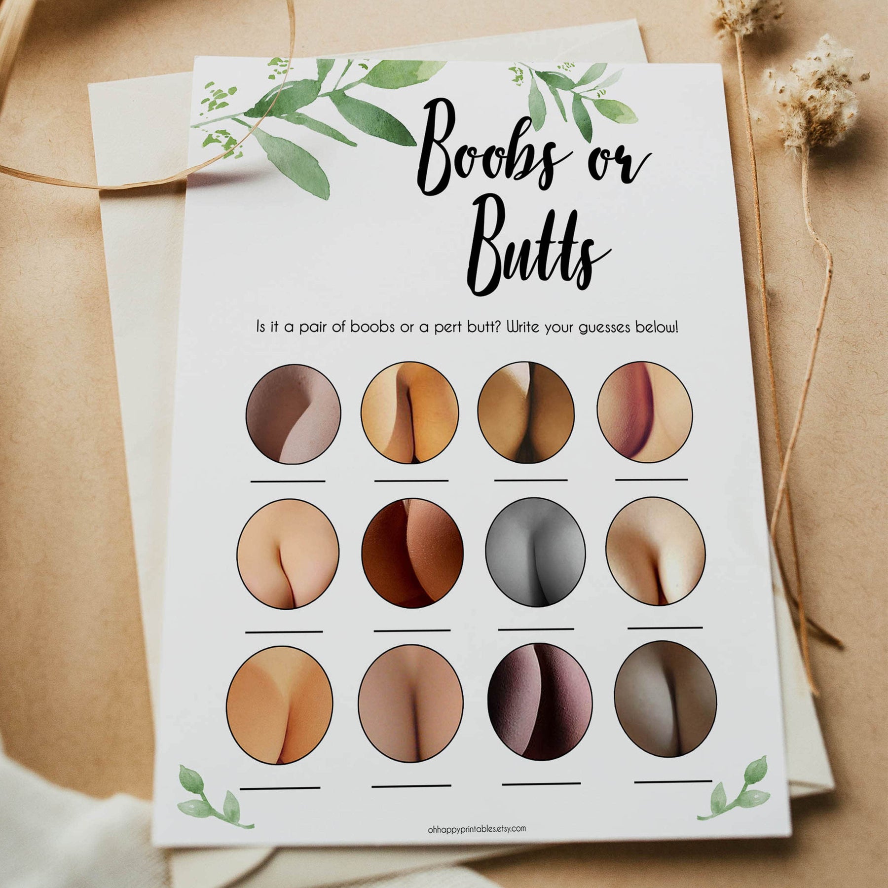 Our printable Boobs or Butts game is a hilarious baby shower game that's perfect for those who like to have a bit of fun! Guess whether the picture is a pair of womans boobs or a butt. Our printable Boobs or Butts game comes complete with answer sheet. All you need to do is download and print at home, it couldn't be easier.
