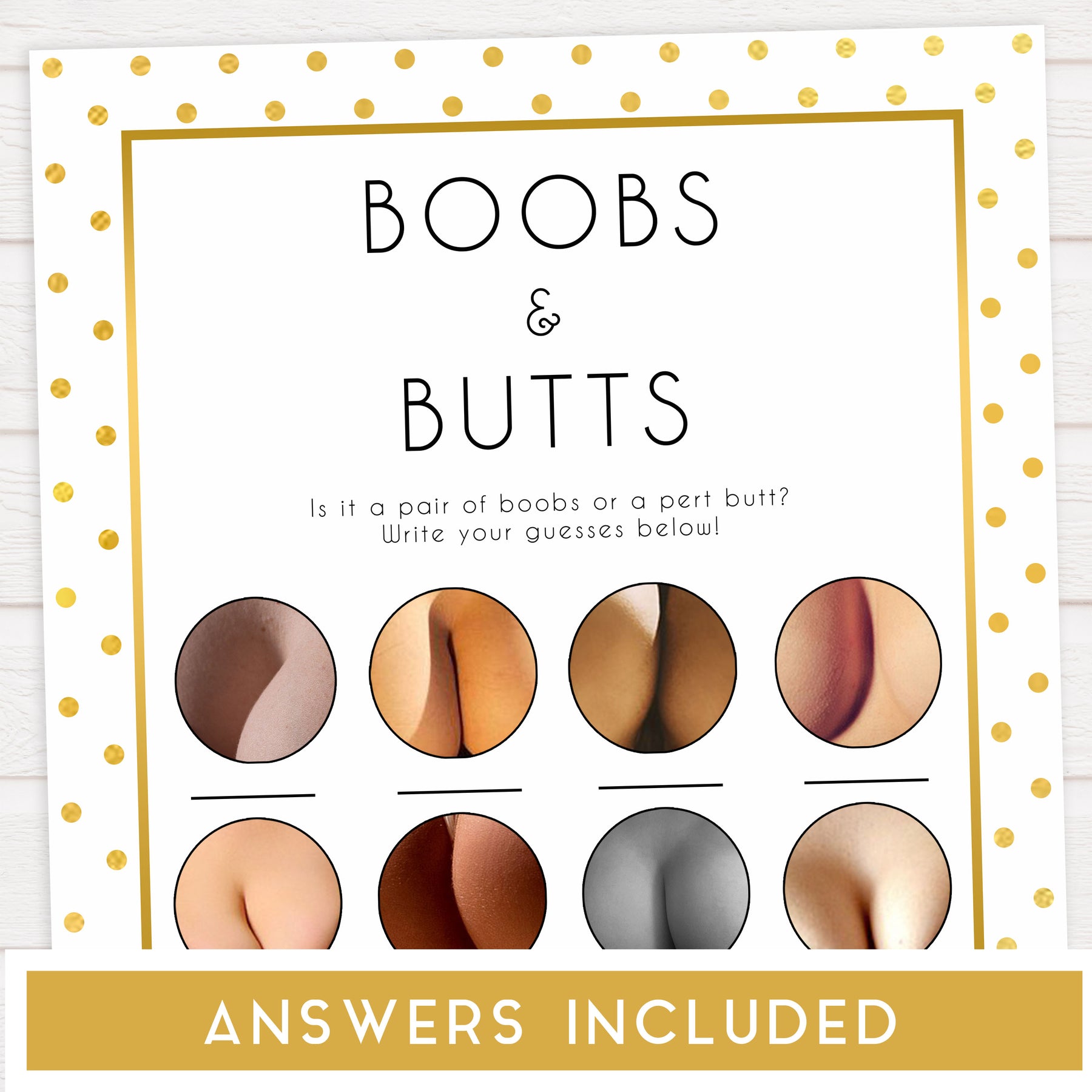 Our printable Boobs or Butts game is a hilarious baby shower game that's perfect for those who like to have a bit of fun! Guess whether the picture is a pair of womans boobs or a butt. Our printable Boobs or Butts game comes complete with answer sheet. All you need to do is download and print at home, it couldn't be easier.