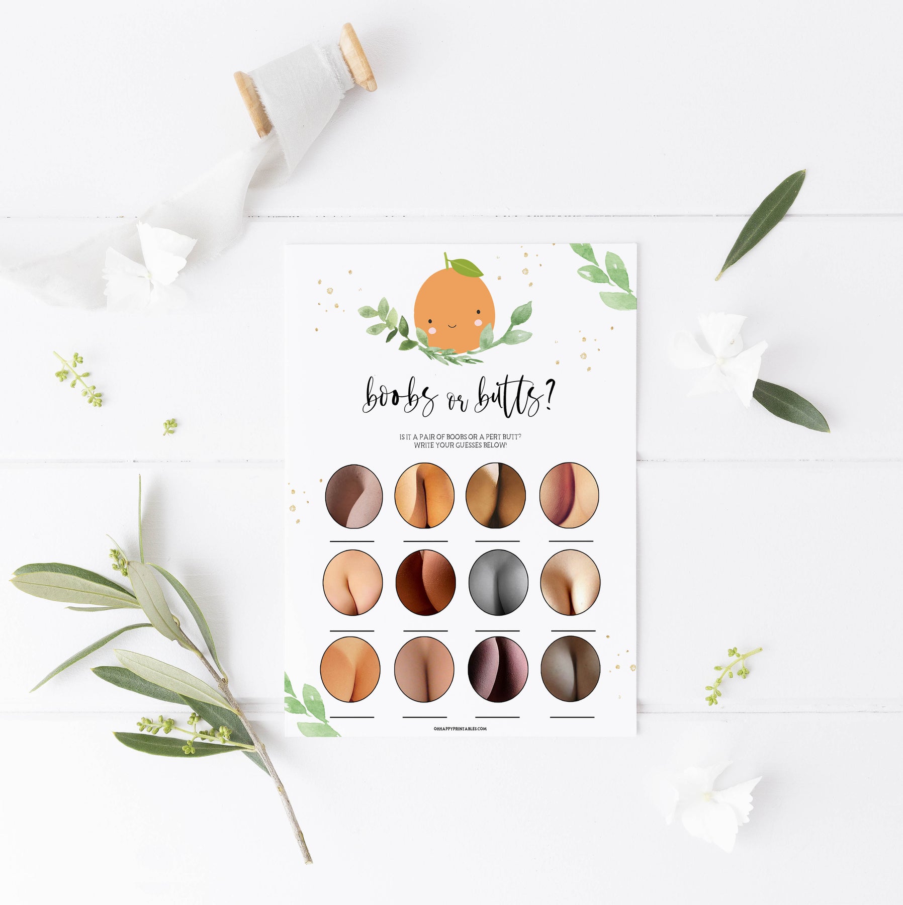 Our printable Boobs or Butts game is a hilarious baby shower game that's perfect for those who like to have a bit of fun! Guess whether the picture is a pair of womans boobs or a butt. Our printable Boobs or Butts game comes complete with answer sheet. All you need to do is download and print at home, it couldn't be easier.