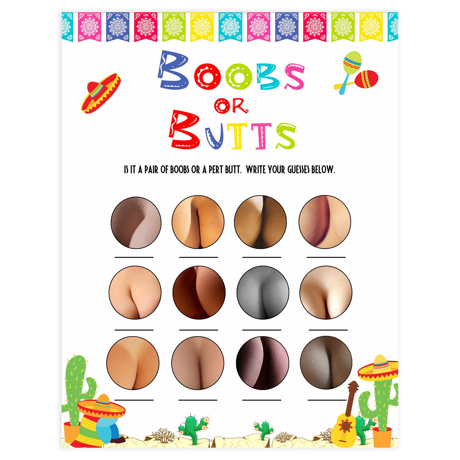 Our printable Boobs or Butts game is a hilarious baby shower game that's perfect for those who like to have a bit of fun! Guess whether the picture is a pair of womans boobs or a butt. Our printable Boobs or Butts game comes complete with answer sheet. All you need to do is download and print at home, it couldn't be easier.