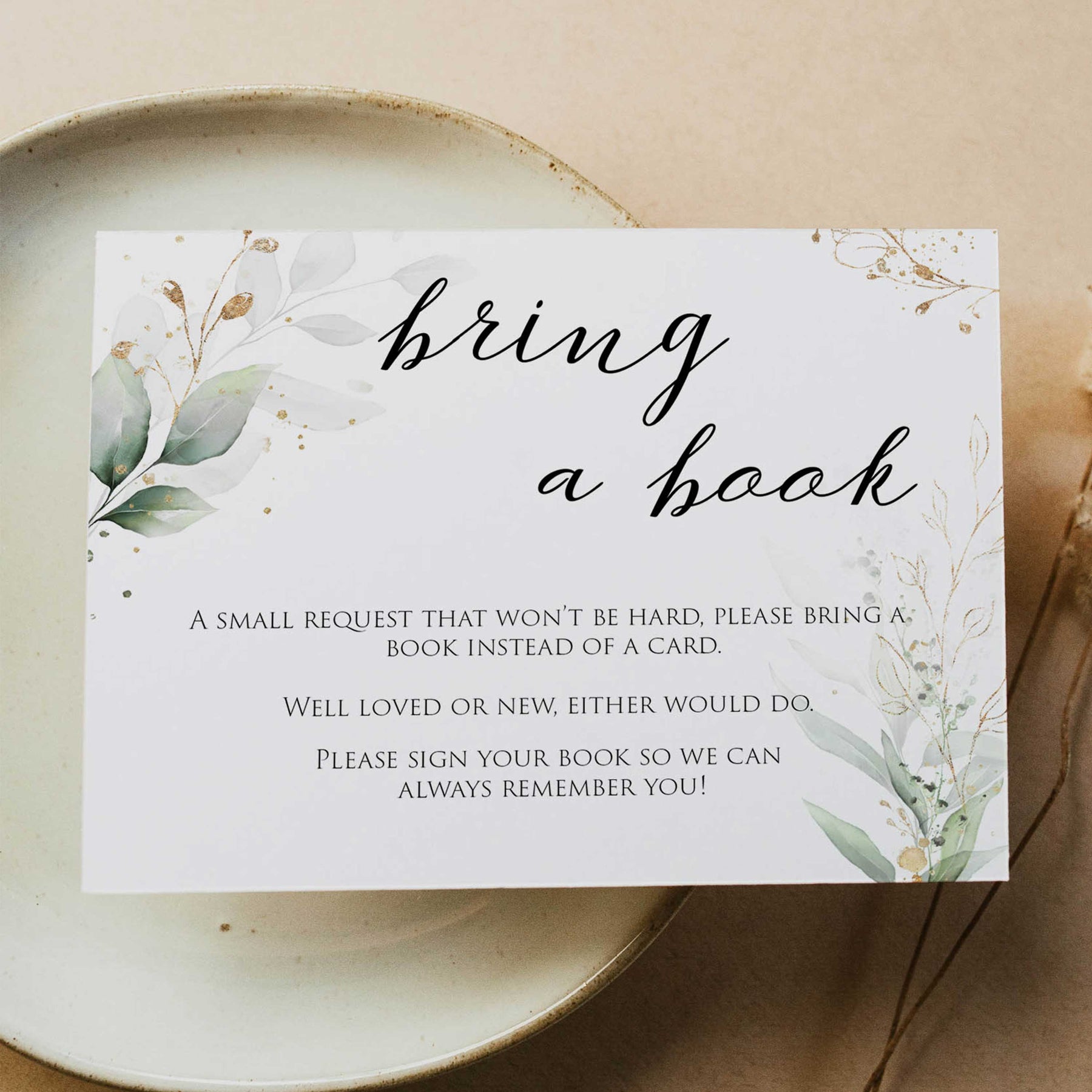 Gold green leaf baby games, bring a book, books for baby, printable baby games, fun baby games, top baby games to play, gold leaf baby shower, greenery baby shower ideas