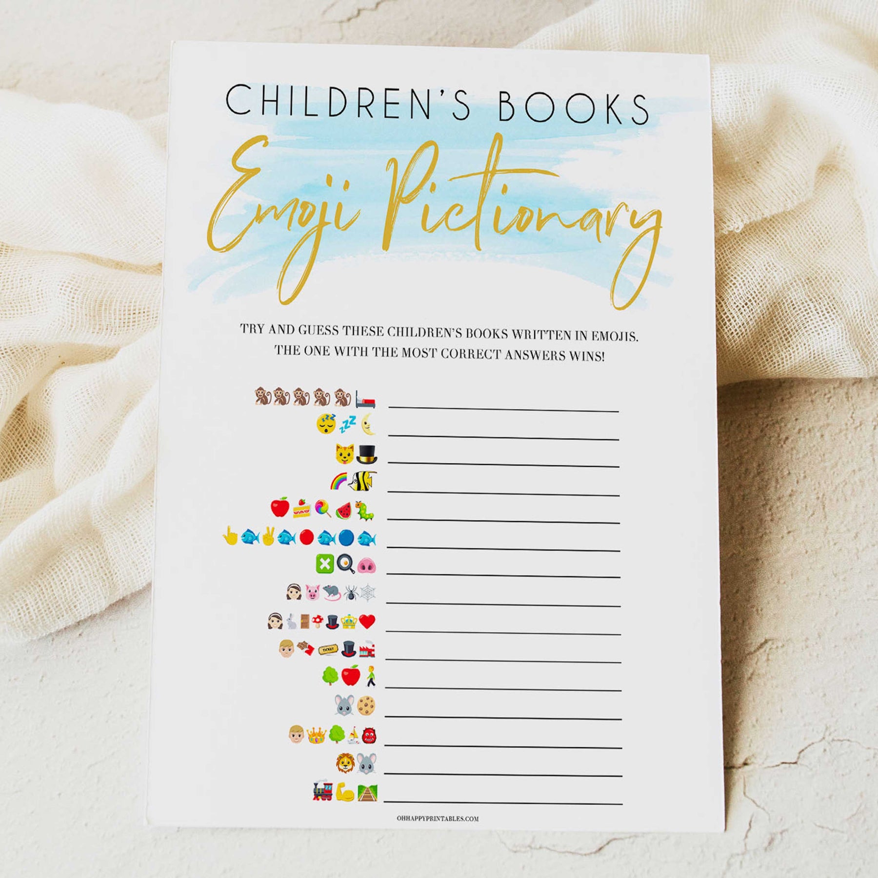 A hilarious baby shower game that's great for friends and family who like to have a bit of fun! Have your friends guess the Children books spelt out in emojis. This printable game comes with an answer key.