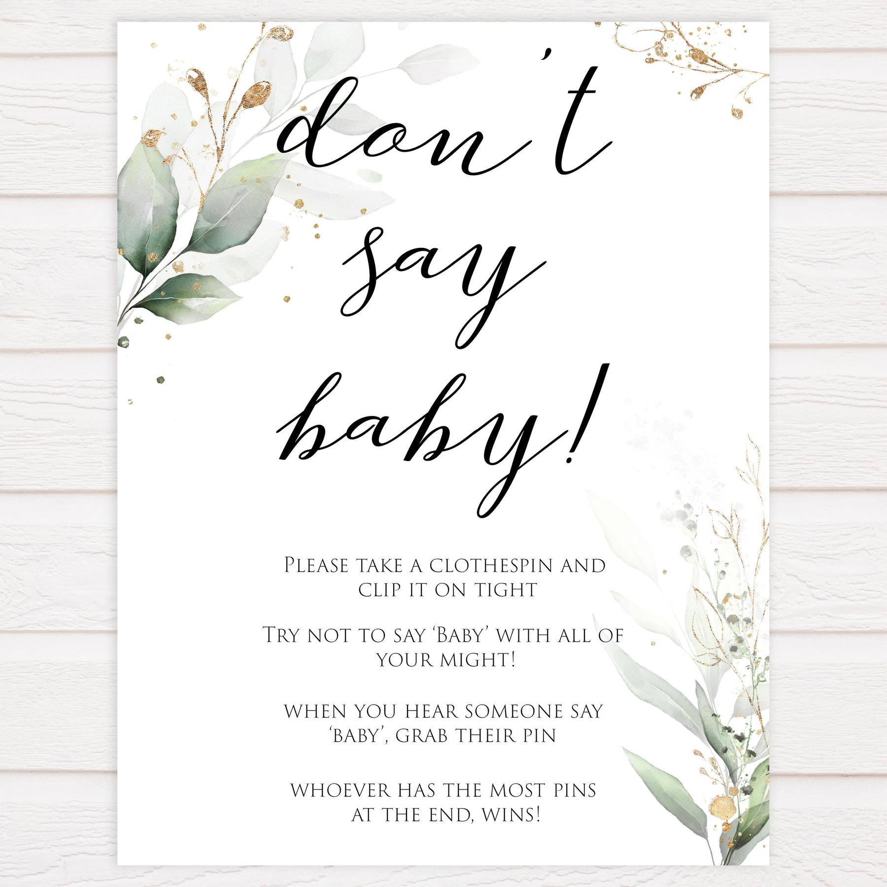 Gold green leaf baby games, dont say baby, printable baby games, fun baby games, top baby games to play, gold leaf baby shower, greenery baby shower ideas
