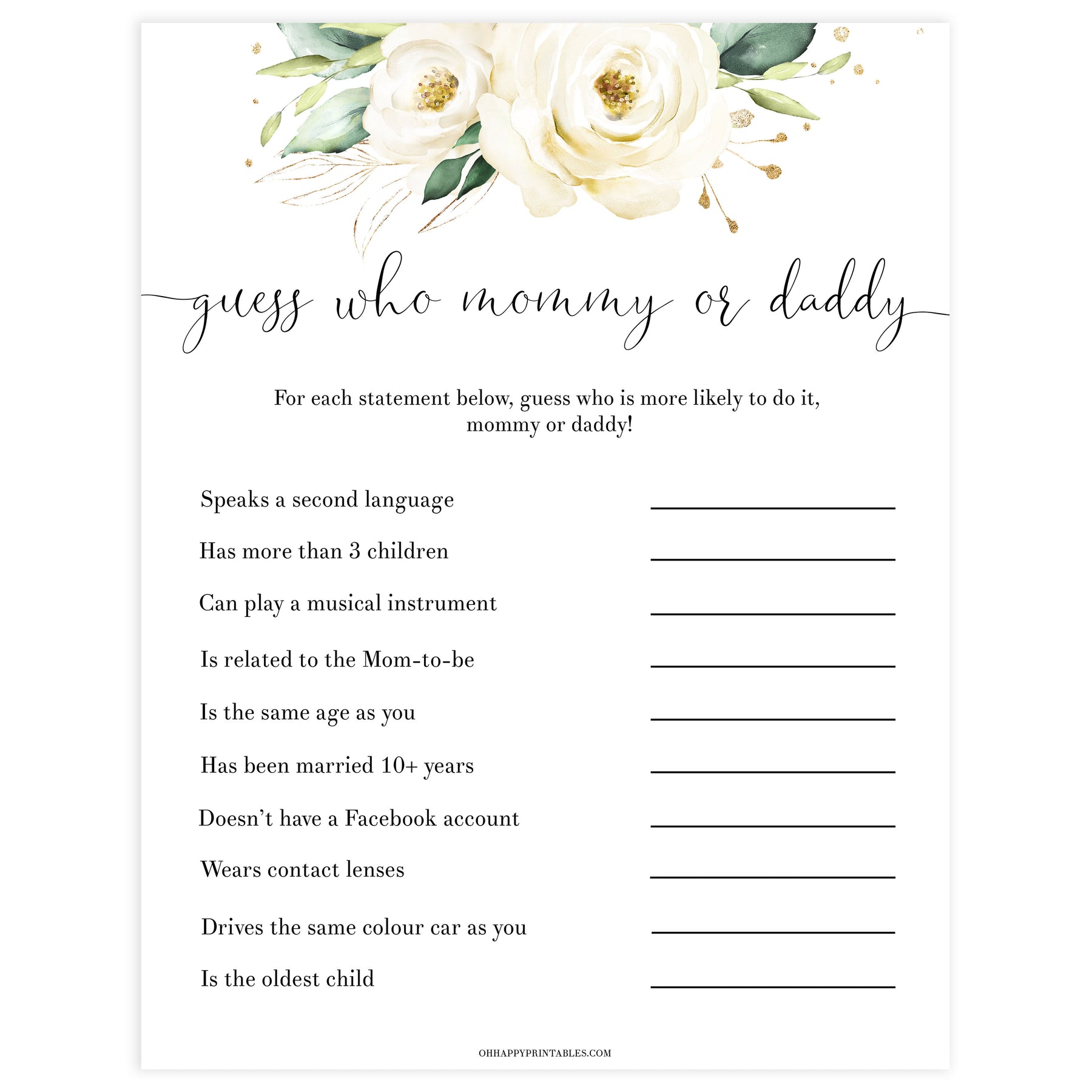 A hilarious baby shower game that's great for new parents who like to have a bit of fun! Have your friends guess if either mommy or daddy would say each of the 20 statements. Provided in both UK and US spelling.