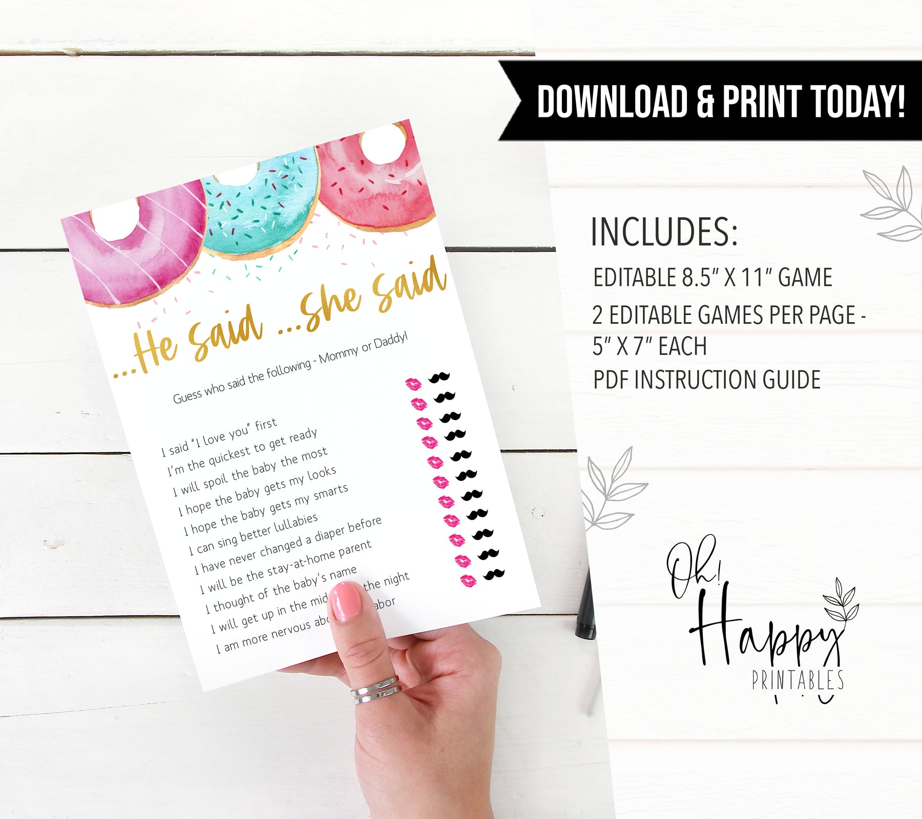 editable baby games, he said she said baby game, Printable baby shower games, donut baby games, baby shower games, fun baby shower ideas, top baby shower ideas, donut sprinkles baby shower, baby shower games, fun donut baby shower ideas