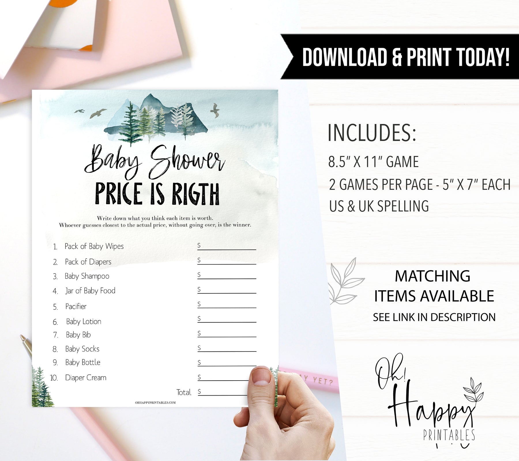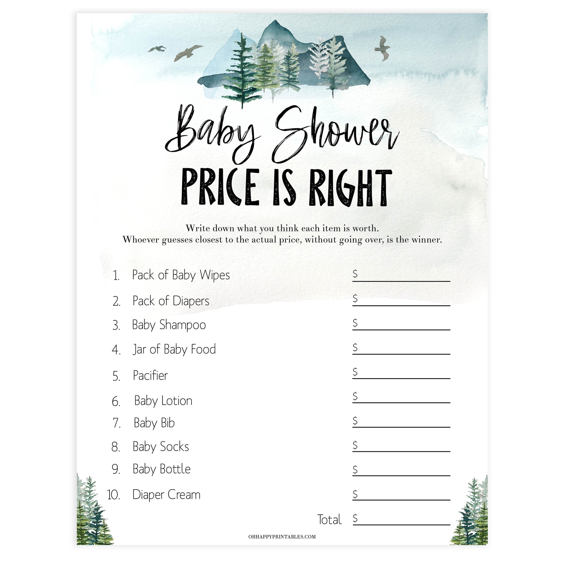 This Baby Shower Price is Right game contains 10 must have baby items. All the guests have to guess what the cost of each item was. The hostess purchases the items prior to the Baby Shower, keeping the receipt. With the products on display, guests fill out their cards and overall total. When everyone is finished, the hostess reveals the individual costs and total from the receipt. The one with the closest answer wins.
