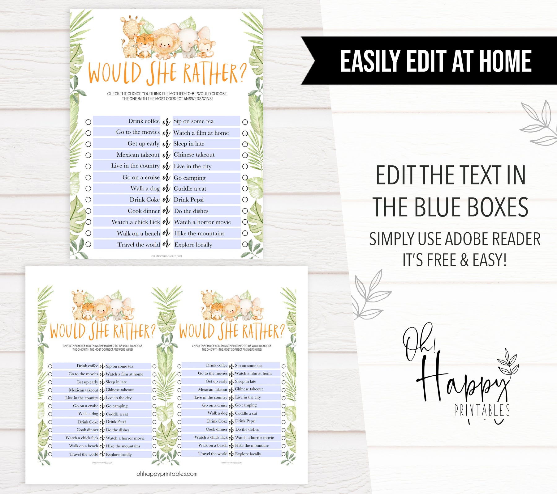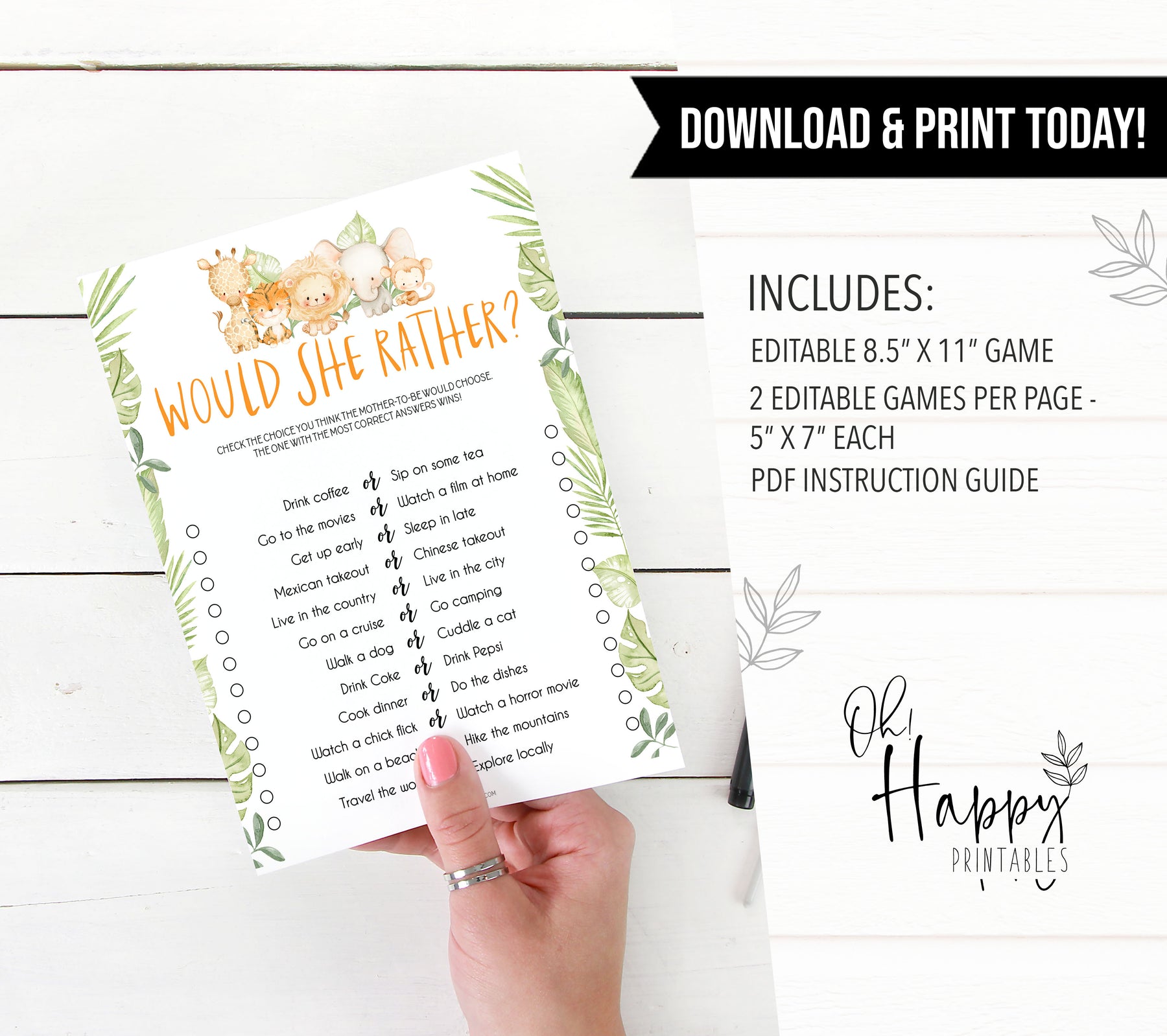 Would She Rather is a popular game that puts the new mother-to-be in the spotlight! Guess what she would do in each of the scenarios! A fun baby shower game that your guests will love to play.