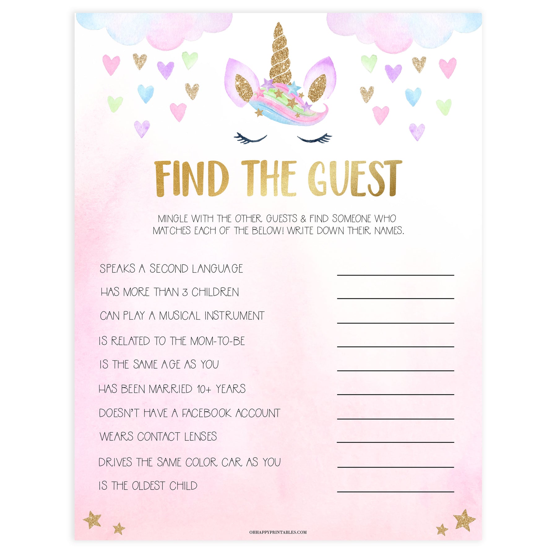 Find the Guest is a great ice breaker game that will help everyone get to know each other at your baby shower. Get ready to ask some questions and mingle like a pro to win! All you need to do is download the game and print at home. It couldn't be easier.