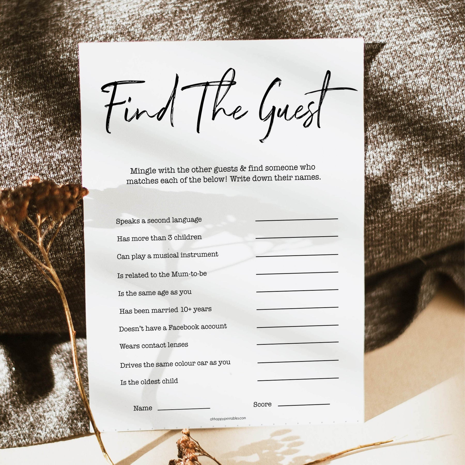 Find the Guest is a great ice breaker game that will help everyone get to know each other at your baby shower. Get ready to ask some questions and mingle like a pro to win! All you need to do is download the game and print at home. It couldn't be easier.
