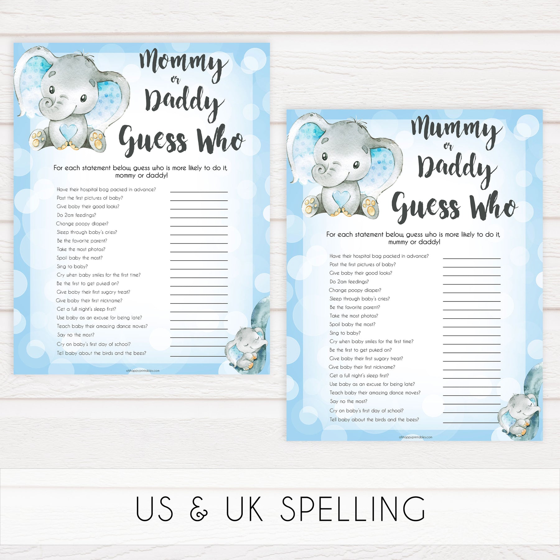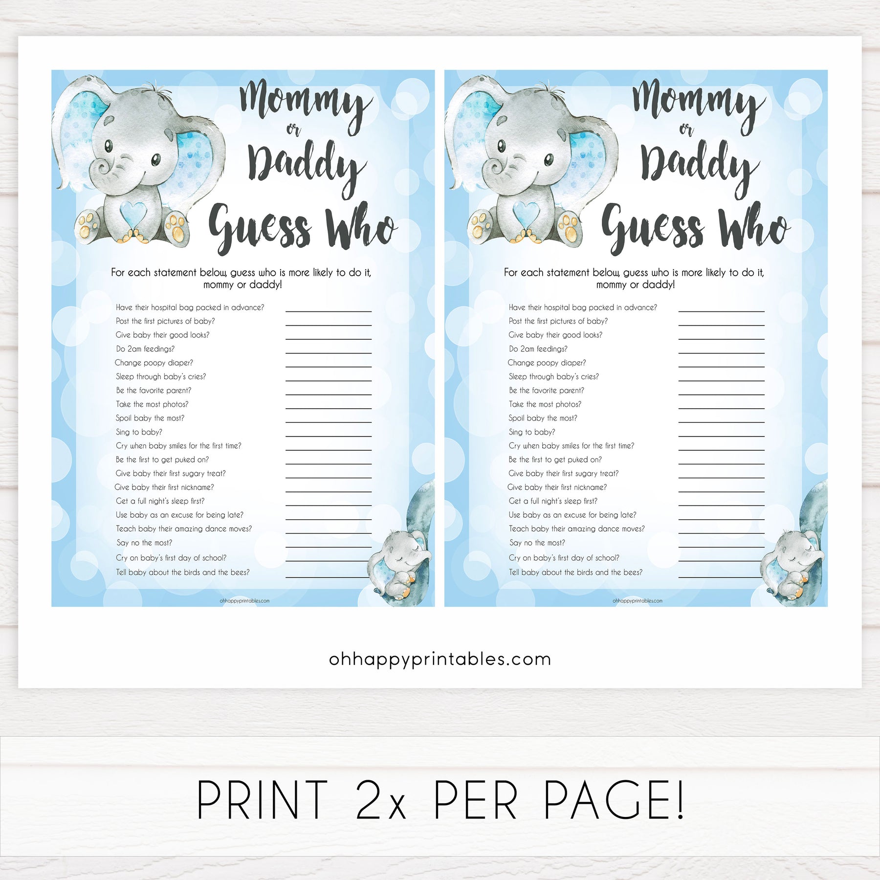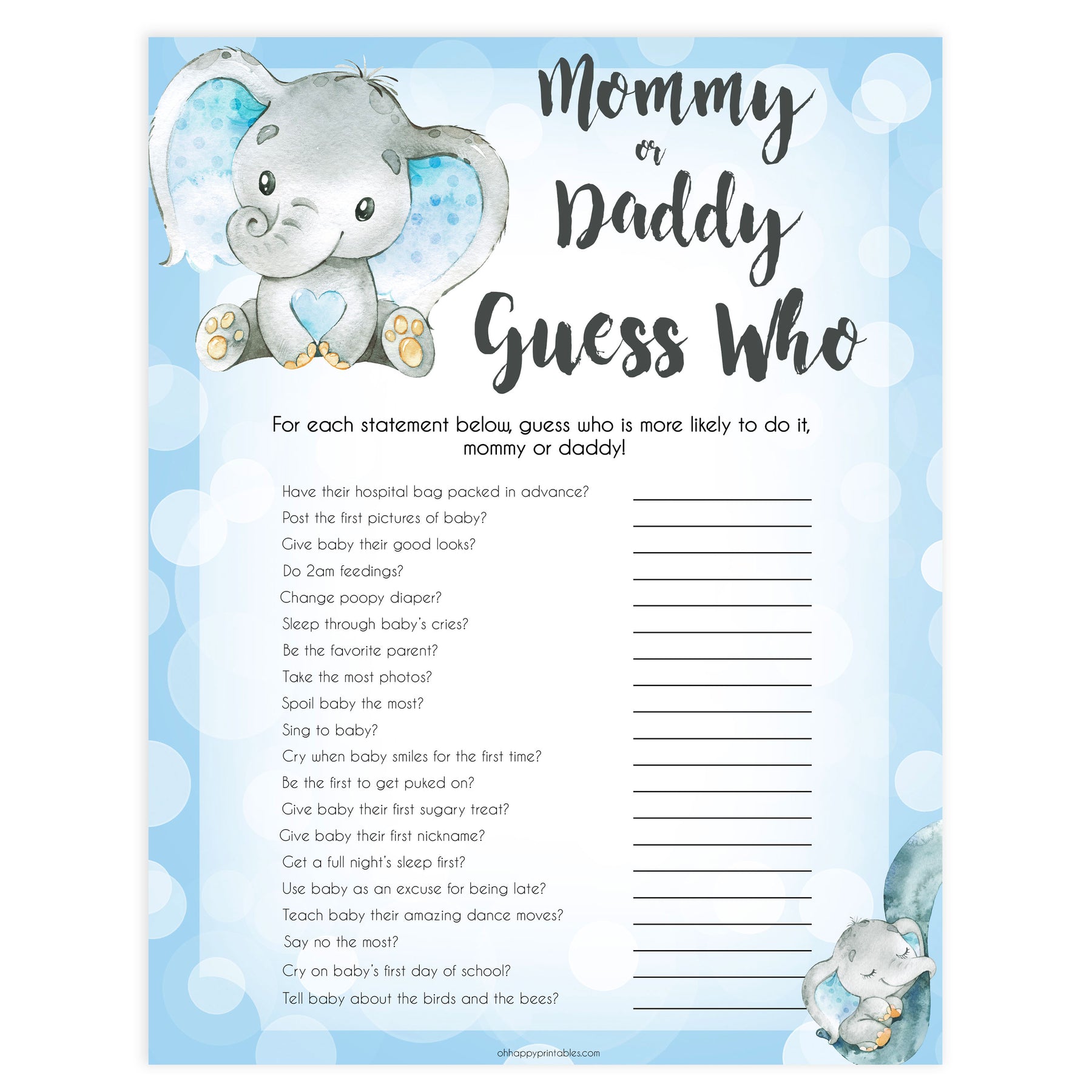 Blue elephant baby games, mommy or daddy guess who game, elephant baby games, printable baby games, top baby games, best baby shower games, baby shower ideas, fun baby games, elephant baby shower