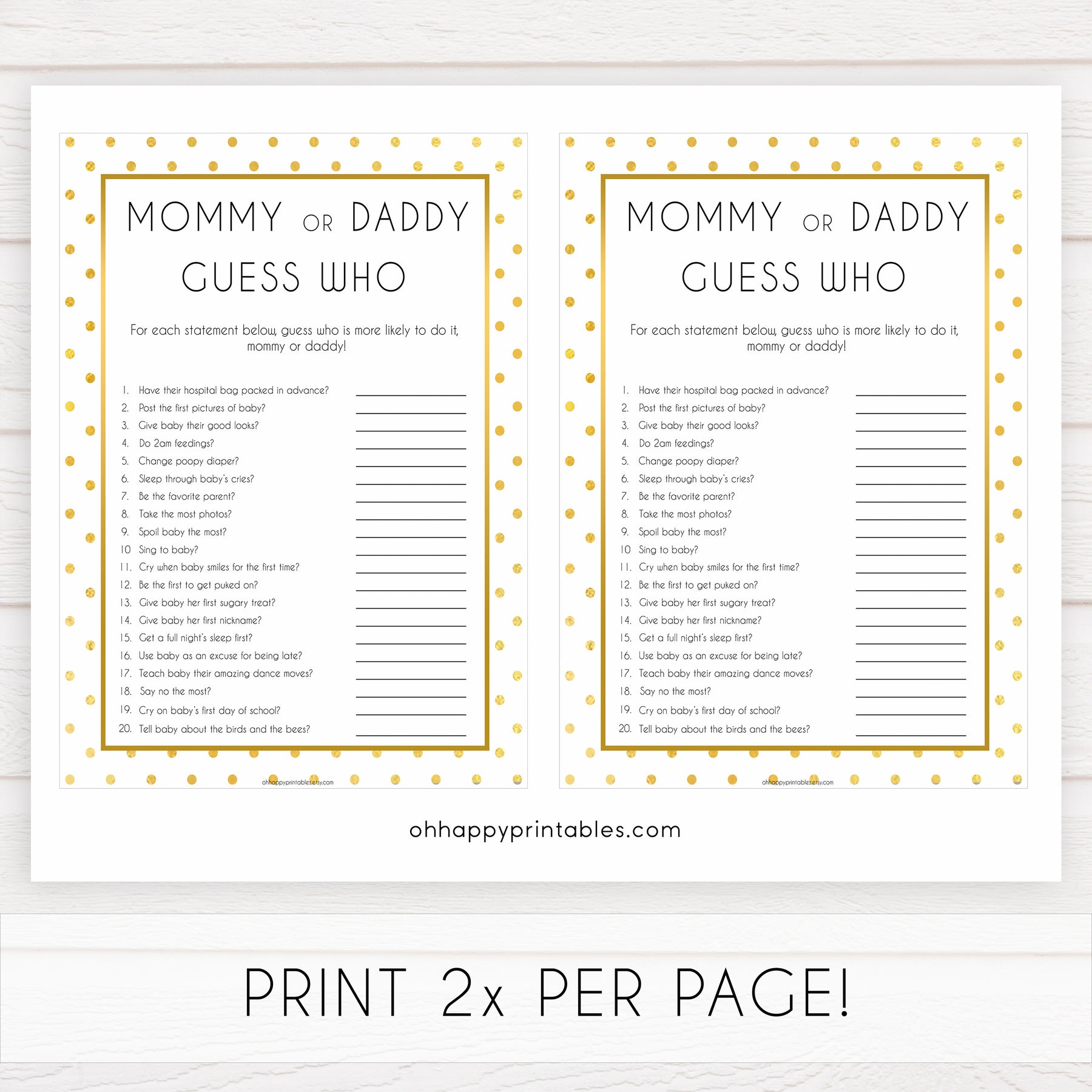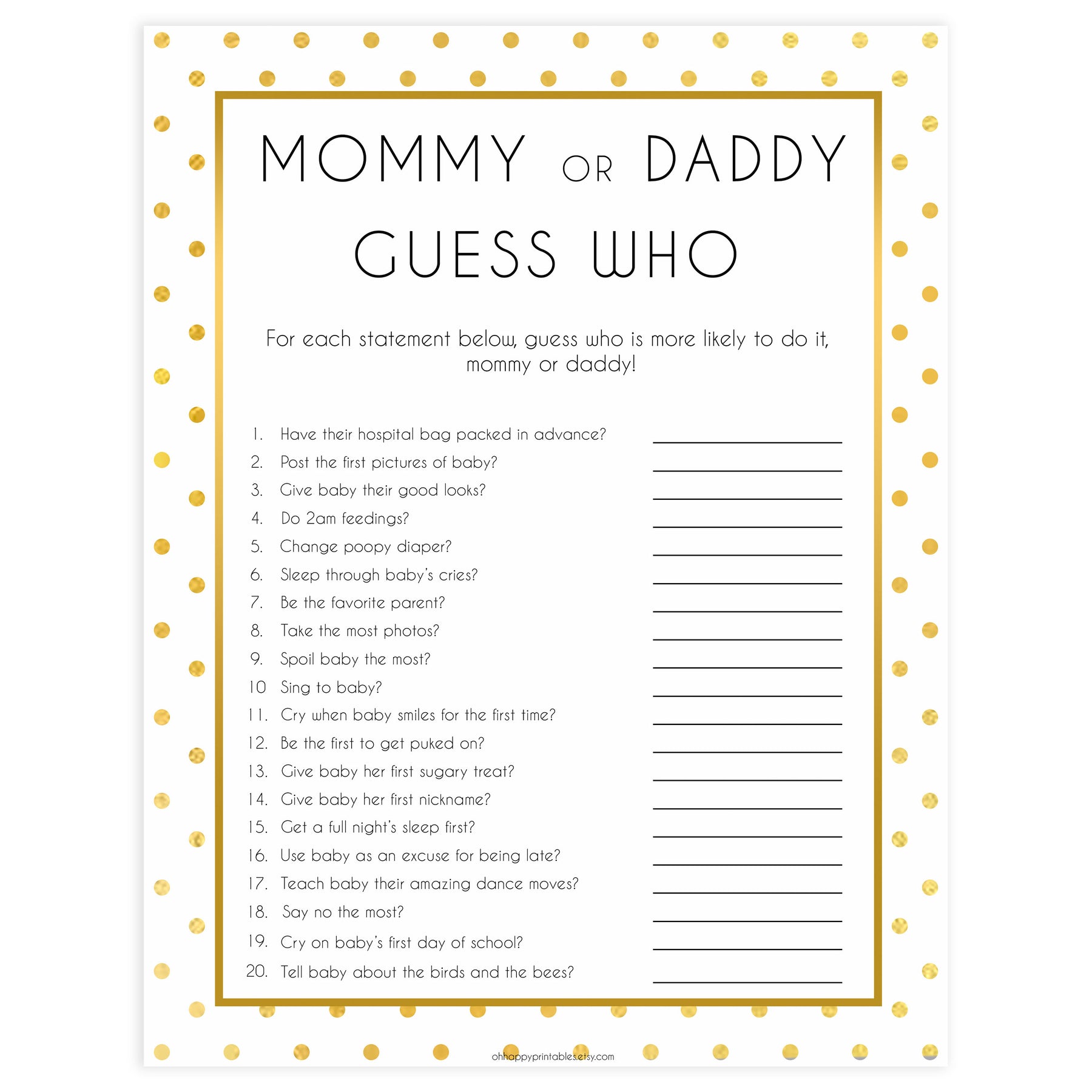 mommy or daddy guess who, guess who baby game, Printable baby shower games, baby gold dots fun baby games, baby shower games, fun baby shower ideas, top baby shower ideas, gold glitter shower baby shower, friends baby shower ideas
