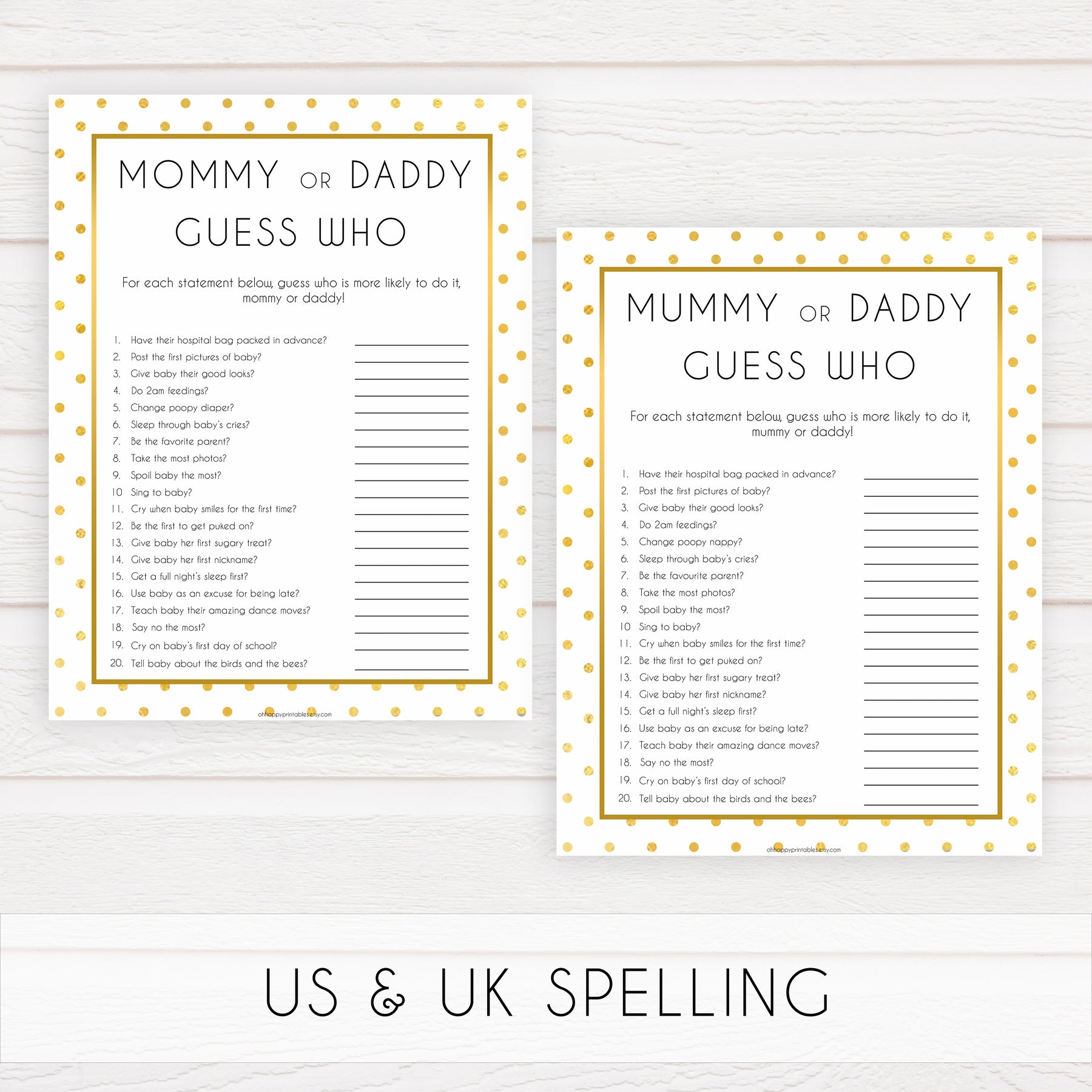 A hilarious baby shower game that's great for new parents who like to have a bit of fun! Have your friends guess if either mommy or daddy would say each of the 20 statements. Provided in both UK and US spelling.