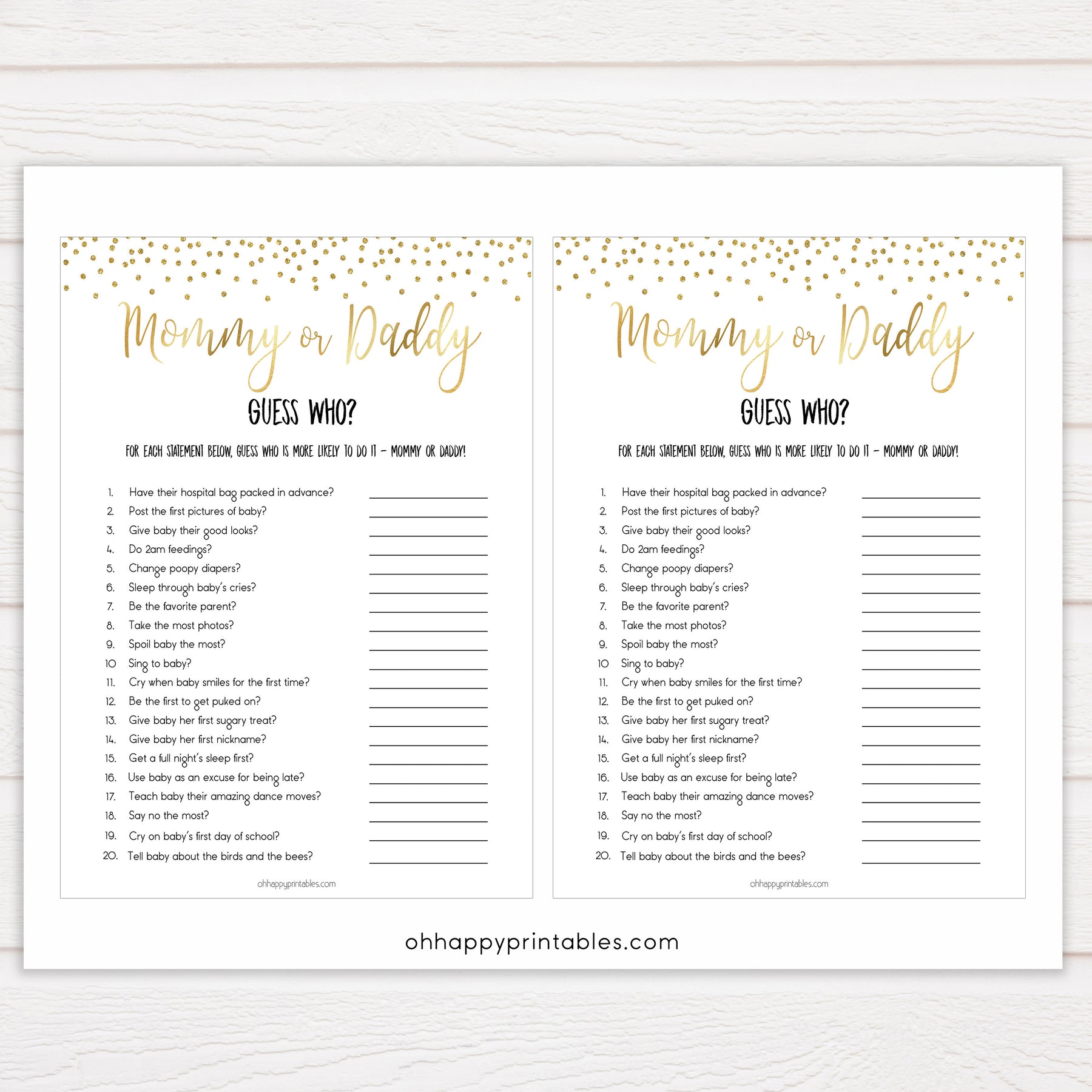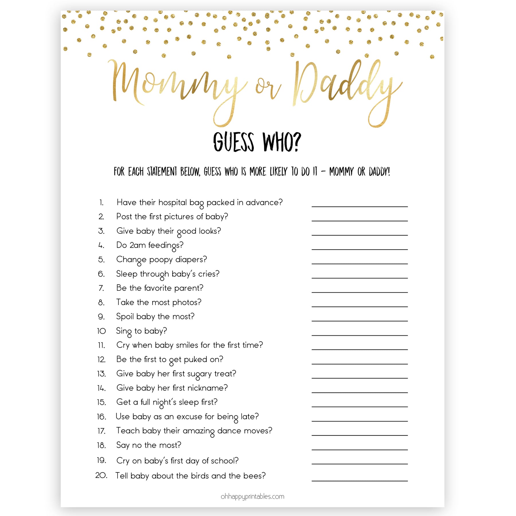 A hilarious baby shower game that's great for new parents who like to have a bit of fun! Have your friends guess if either mommy or daddy would say each of the 20 statements. Provided in both UK and US spelling.