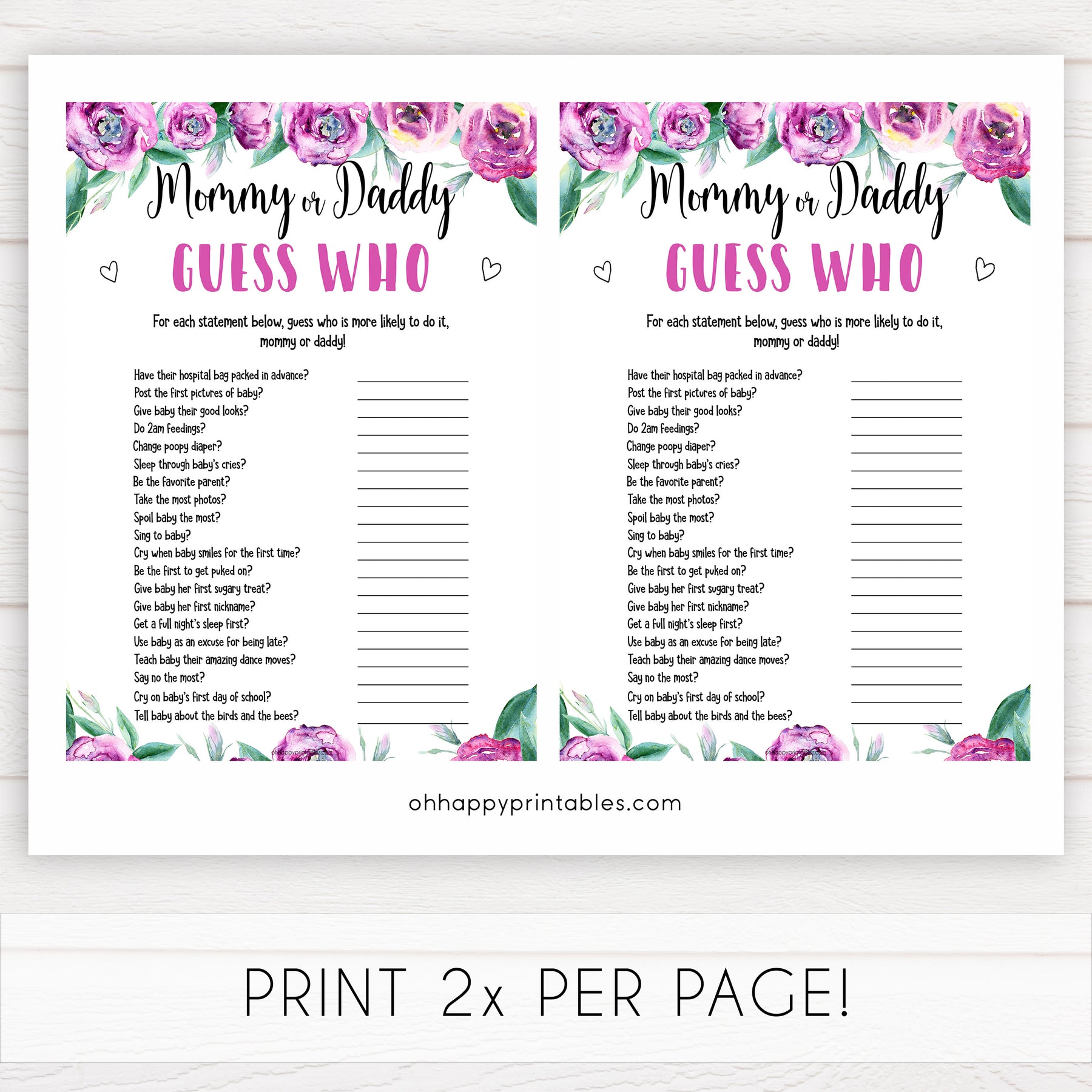 A hilarious baby shower game that's great for new parents who like to have a bit of fun! Have your friends guess if either mommy or daddy would say each of the 20 statements. Provided in both UK and US spelling.