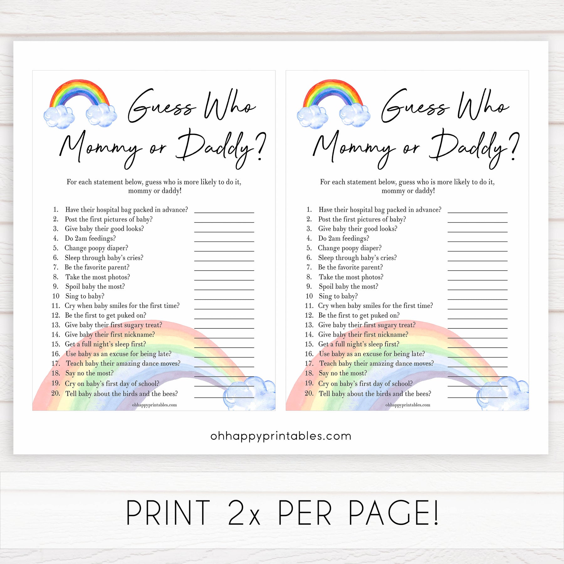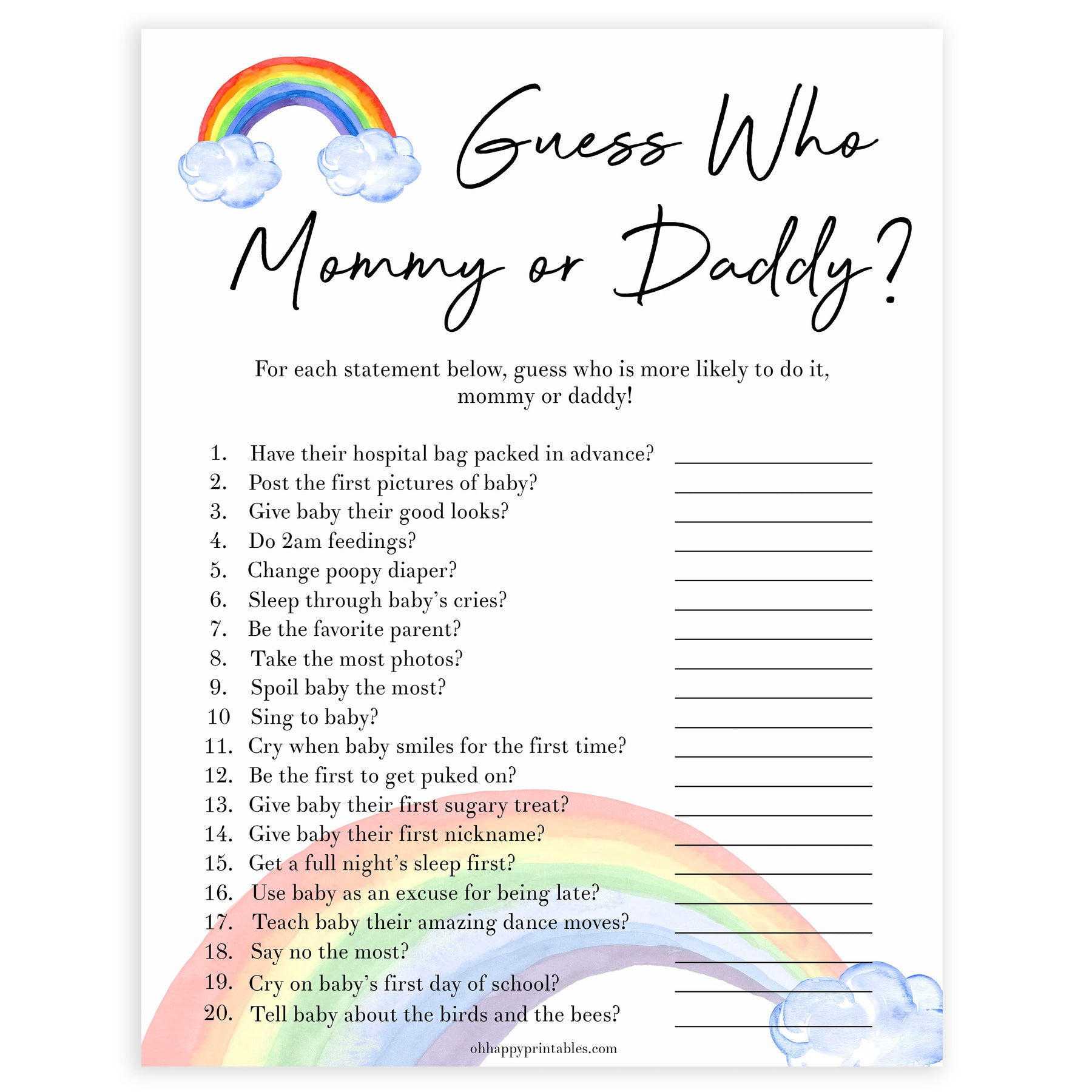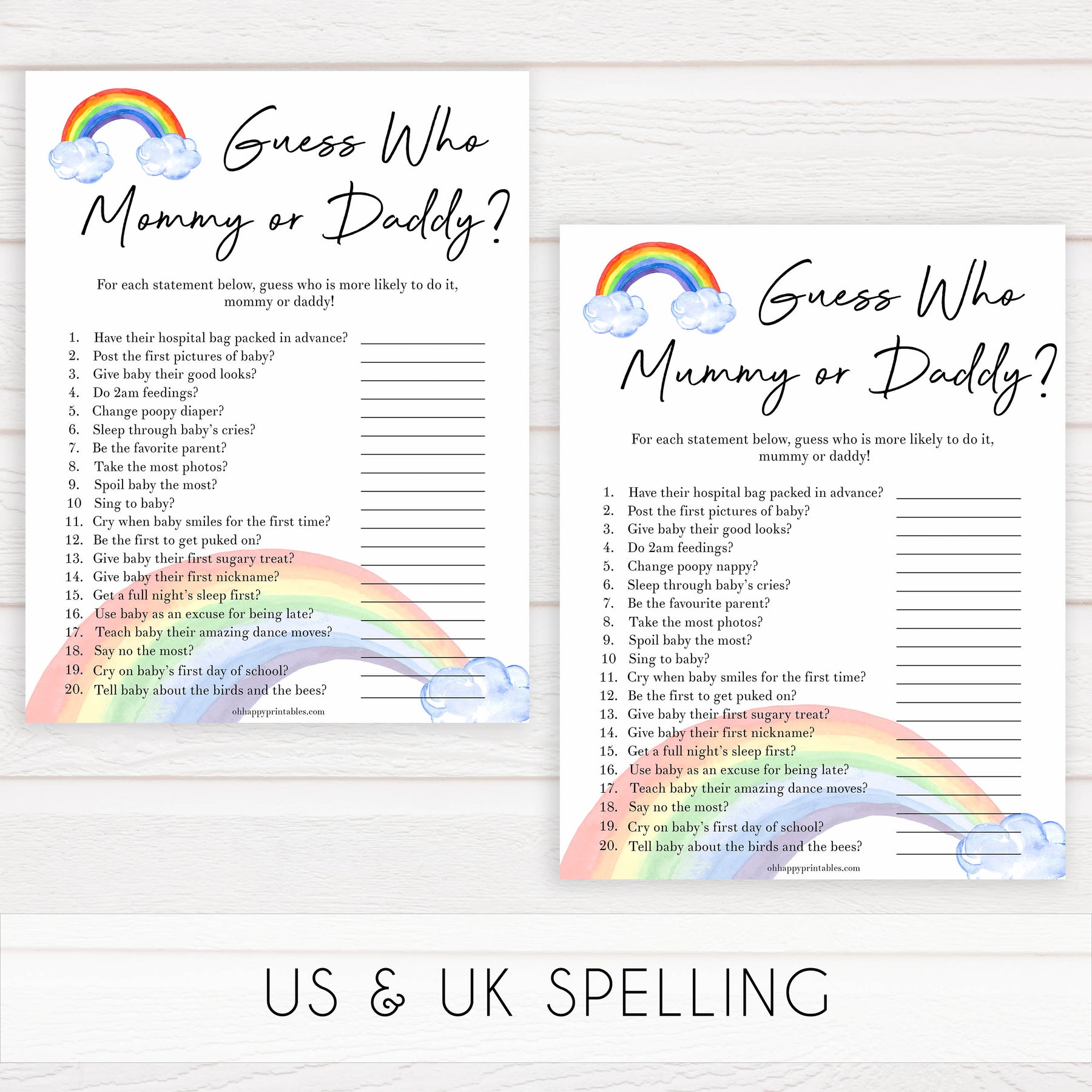 A hilarious baby shower game that's great for new parents who like to have a bit of fun! Have your friends guess if either mommy or daddy would say each of the 20 statements. Provided in both UK and US spelling.
