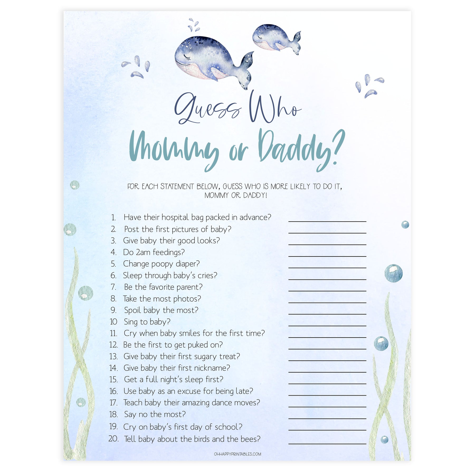 A hilarious baby shower game that's great for new parents who like to have a bit of fun! Have your friends guess if either mommy or daddy would say each of the 20 statements. Provided in both UK and US spelling.