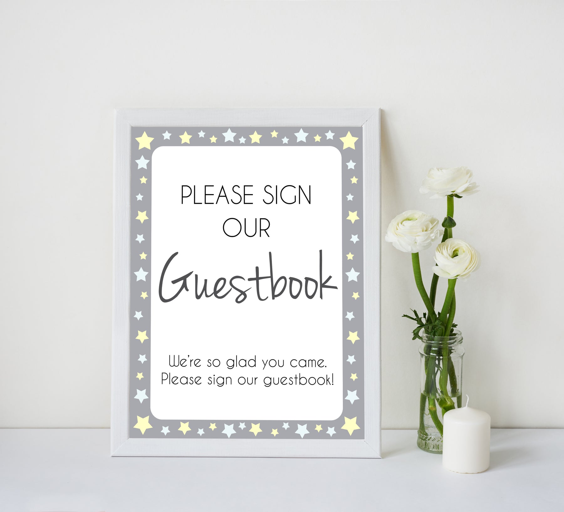 Printable baby signs, guestbook baby sign, yellow and grey stars, printable baby shower signs, top baby shower decor, baby printable decor