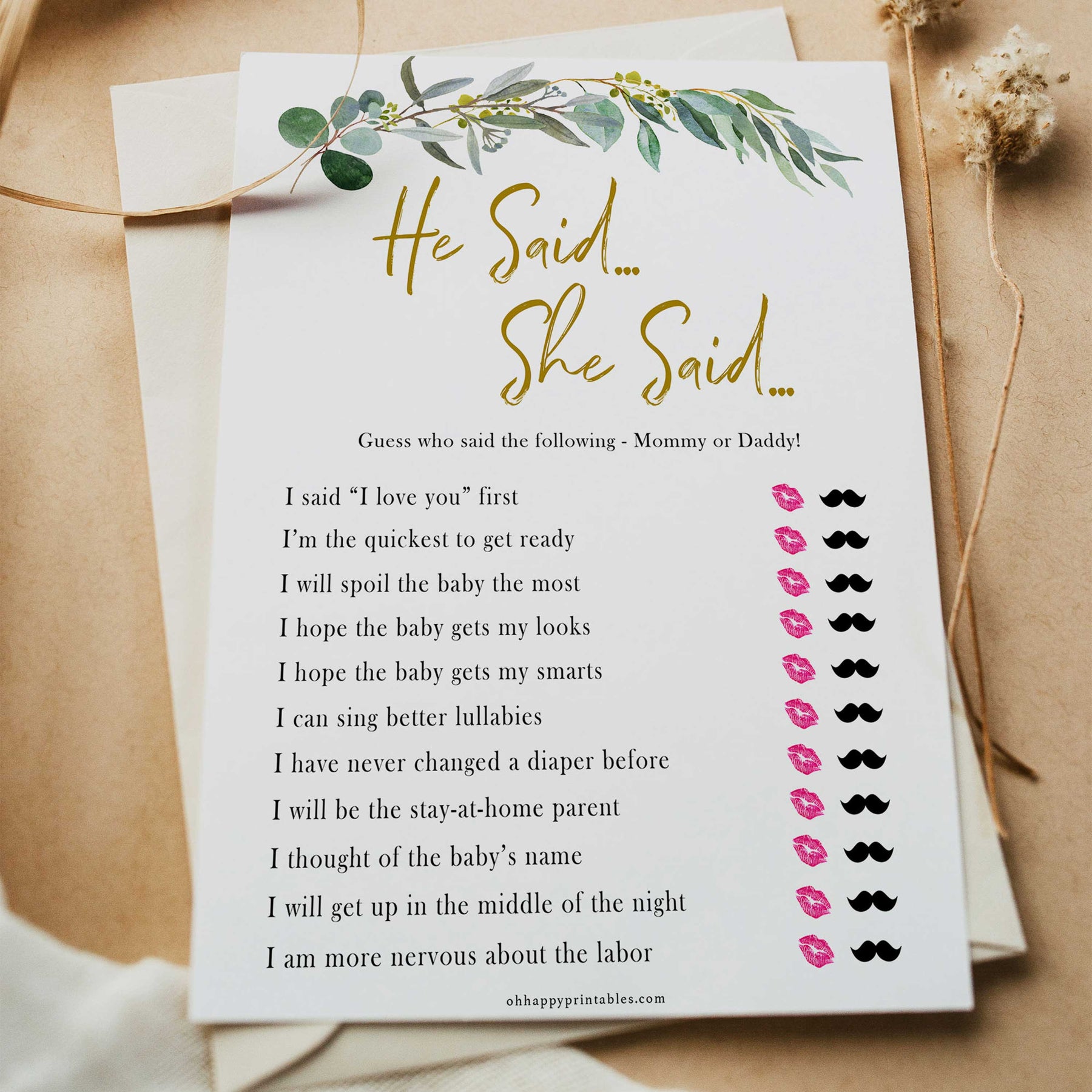 Eucalyptus baby shower games, he said she said baby game, fun baby shower games, printable baby games, baby shower ideas, baby games, baby shower baby shower bundle, baby shower games packs, botanical baby shower