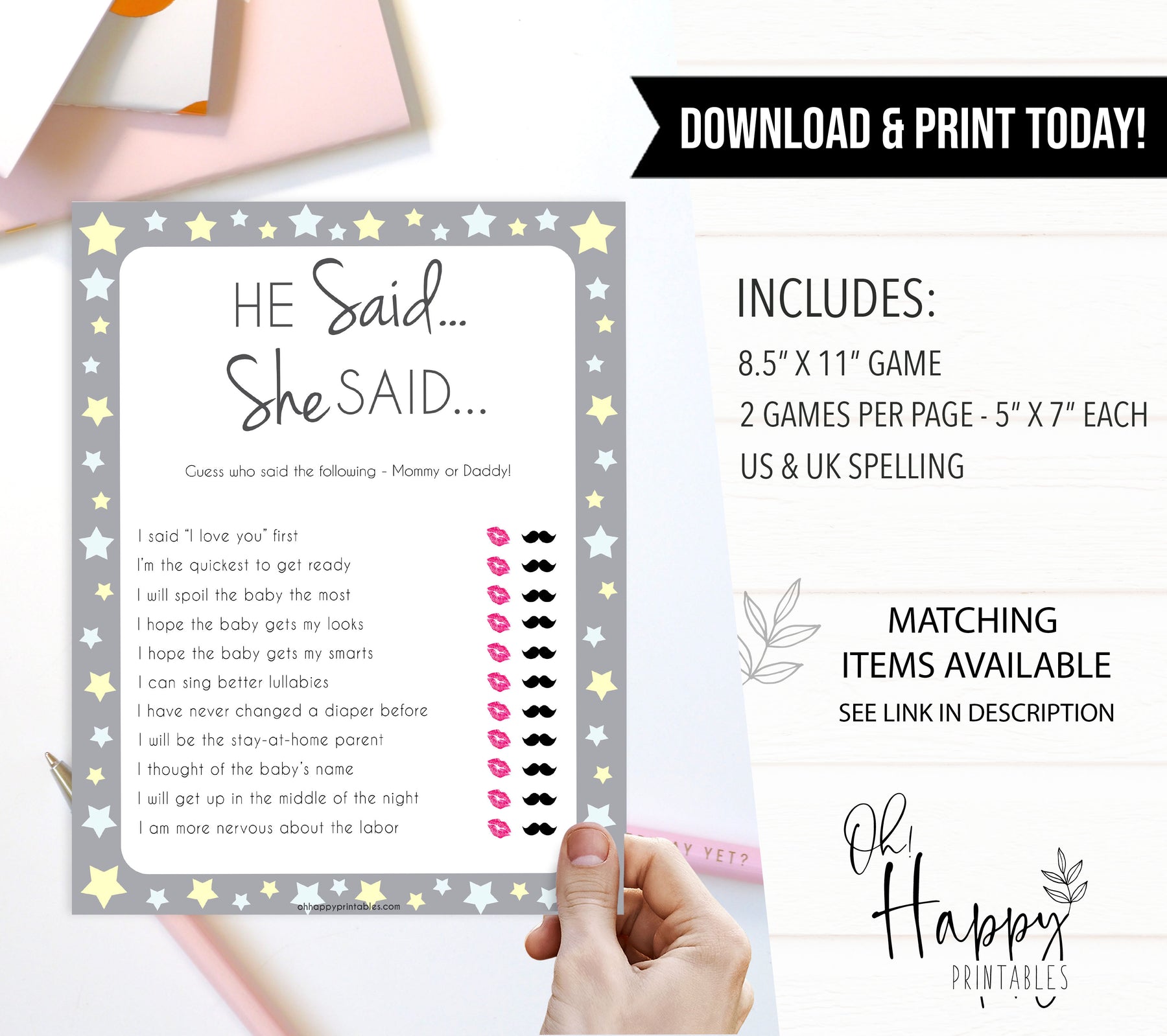 He Said She Said is a great game for your baby shower, and will have everyone in stitches. All you need to do is guess which parent said which phrase. Just download and print at home.