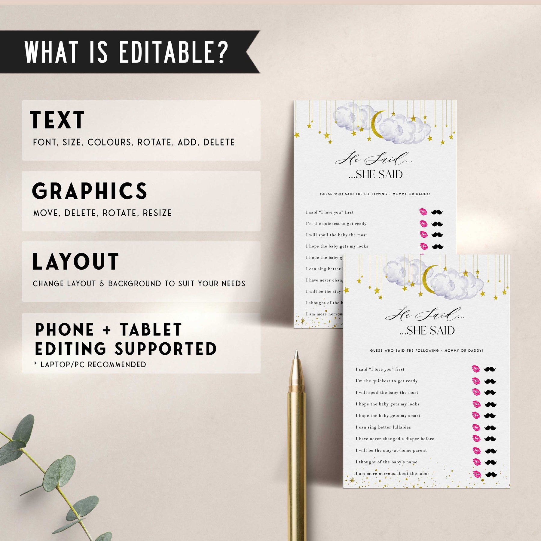 He Said She Said is a great game for your baby shower, and will have everyone in stitches. All you need to do is guess which parent said which phrase. Just edit, download and print at home.
