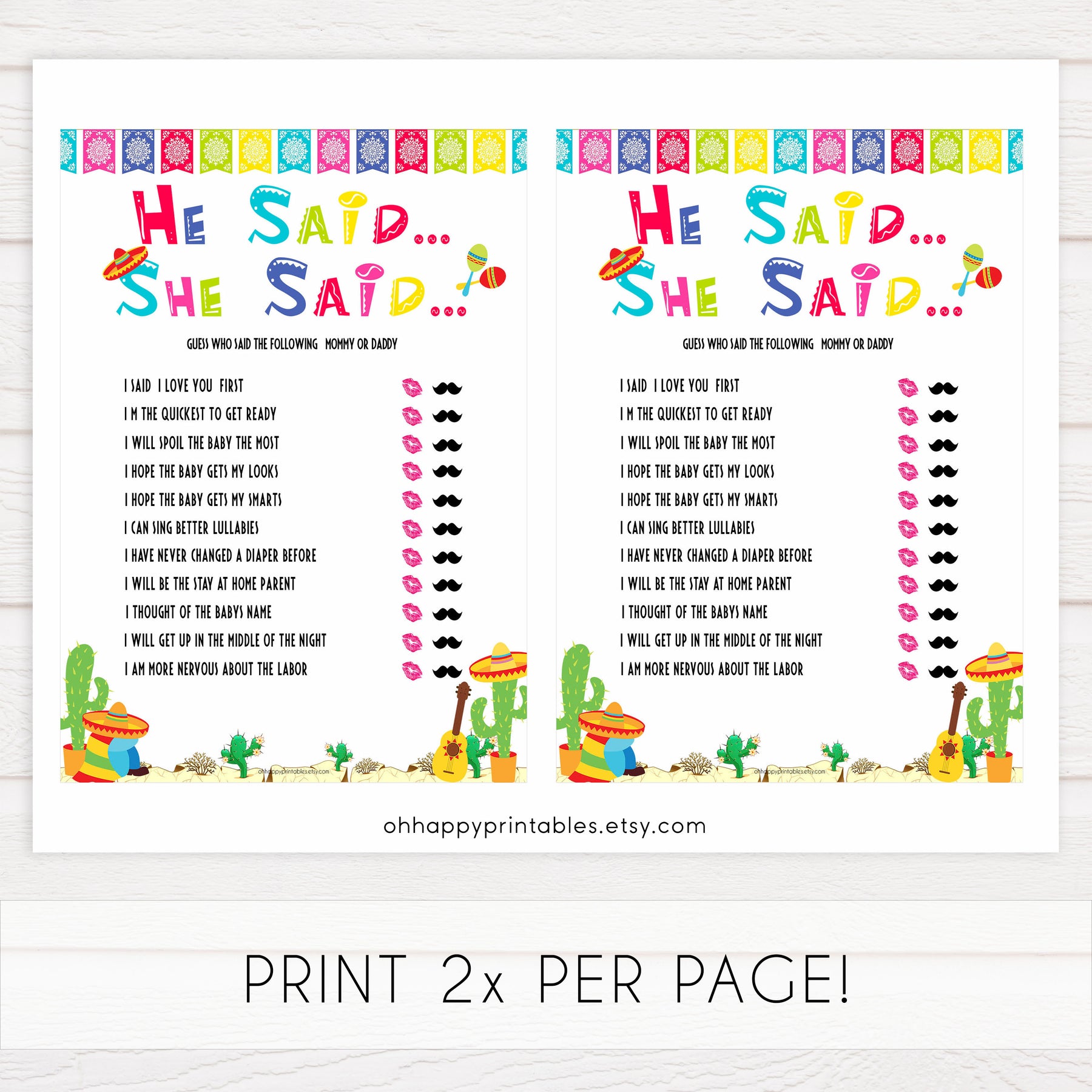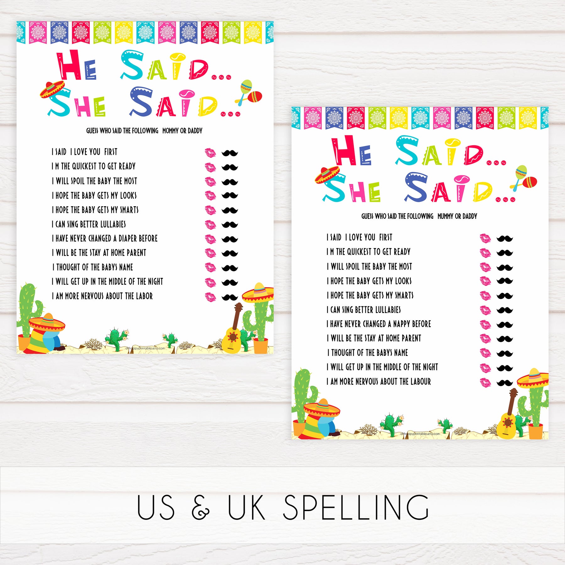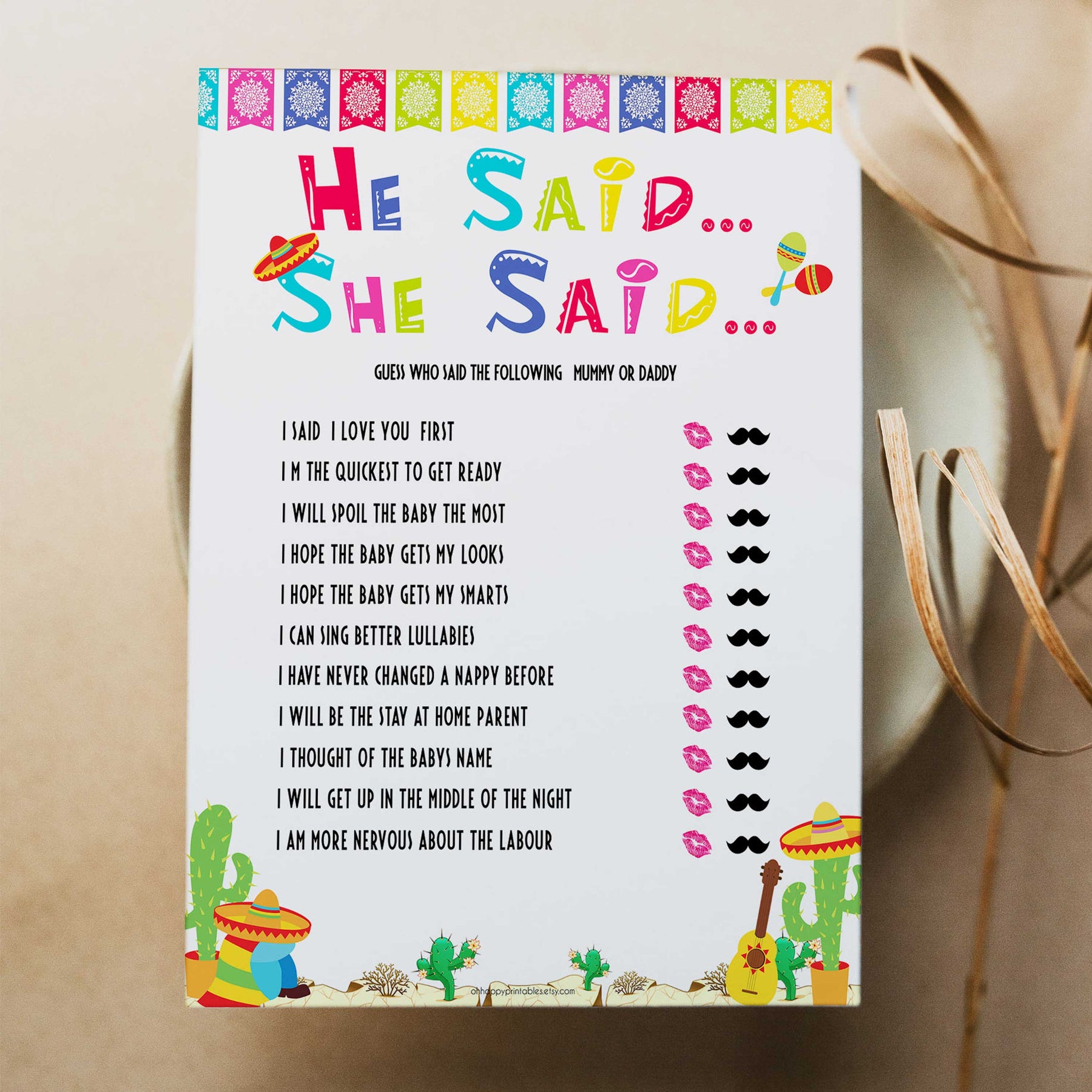 He Said She Said is a great game for your baby shower, and will have everyone in stitches. All you need to do is guess which parent said which phrase. Just download and print at home.