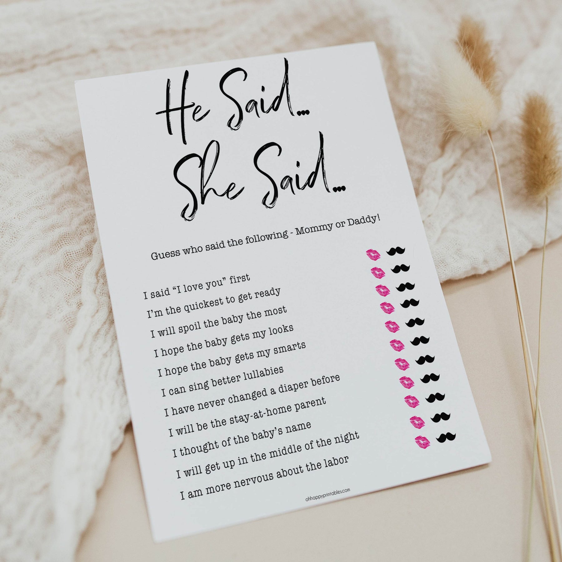 He Said She Said is a great game for your baby shower, and will have everyone in stitches. All you need to do is guess which parent said which phrase. Just download and print at home.
