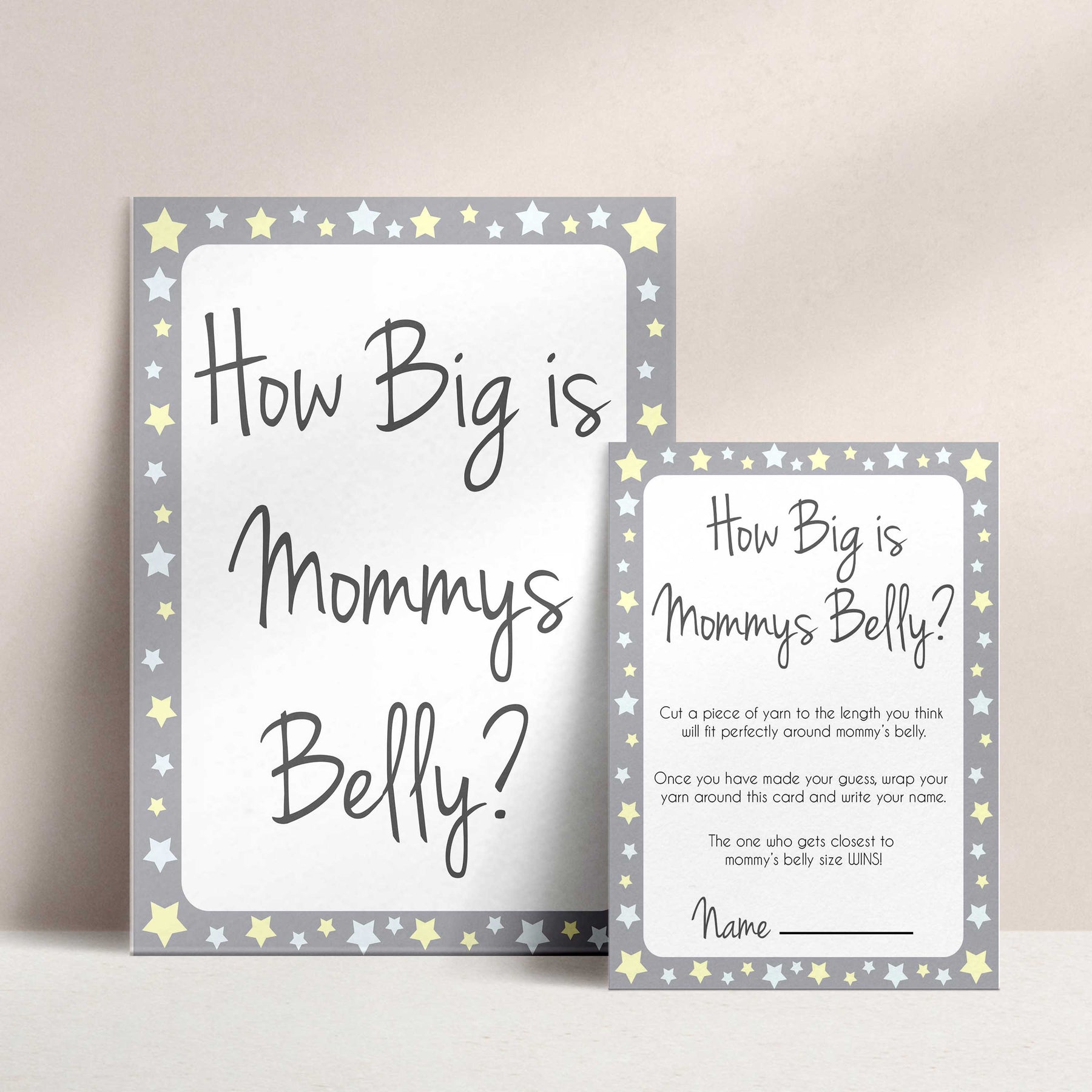 Grey Yellow Stars How Big Is Mommy's Belly, Mommys Belly Game, Printable Baby Shower Games, Grey Stars Baby Games, Guess Mommys Belly, fun abby shower games, popular baby shower games, printable baby shower games