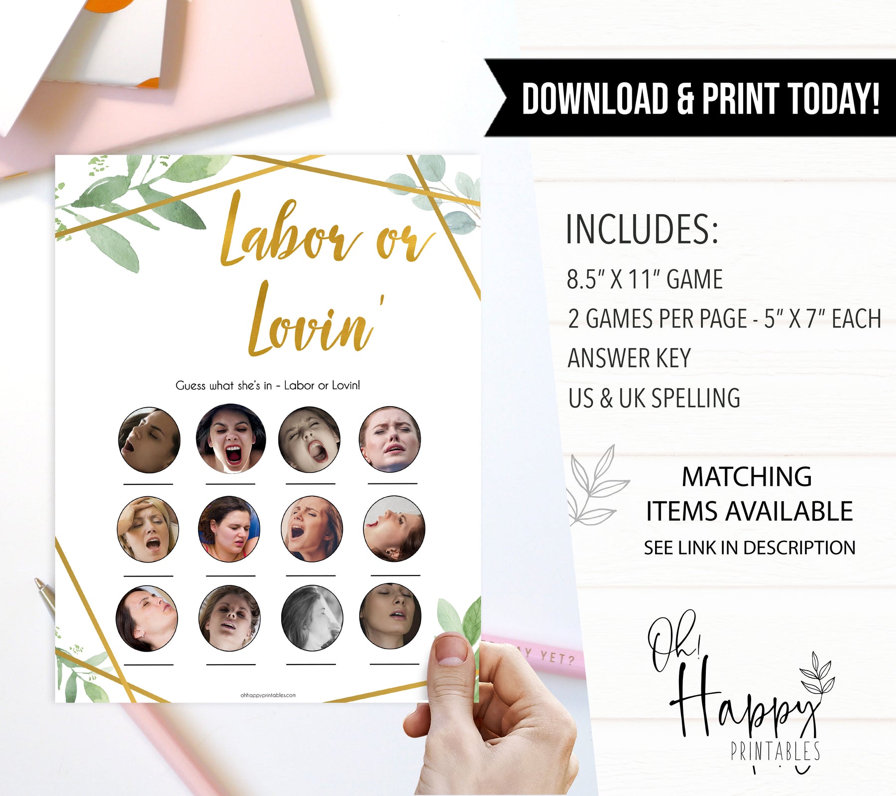 Our printable Labour or Lovin game is a hilarious baby shower game that's perfect for those who like to have a bit of fun! Guess whether the picture is a woman in labour, or from a XXX film. Our printable Labour or Lovin game comes complete with answer sheet, and is available in both UK and US spelling and in two sizes. All you need to do is download and print at home, it couldn't be easier.