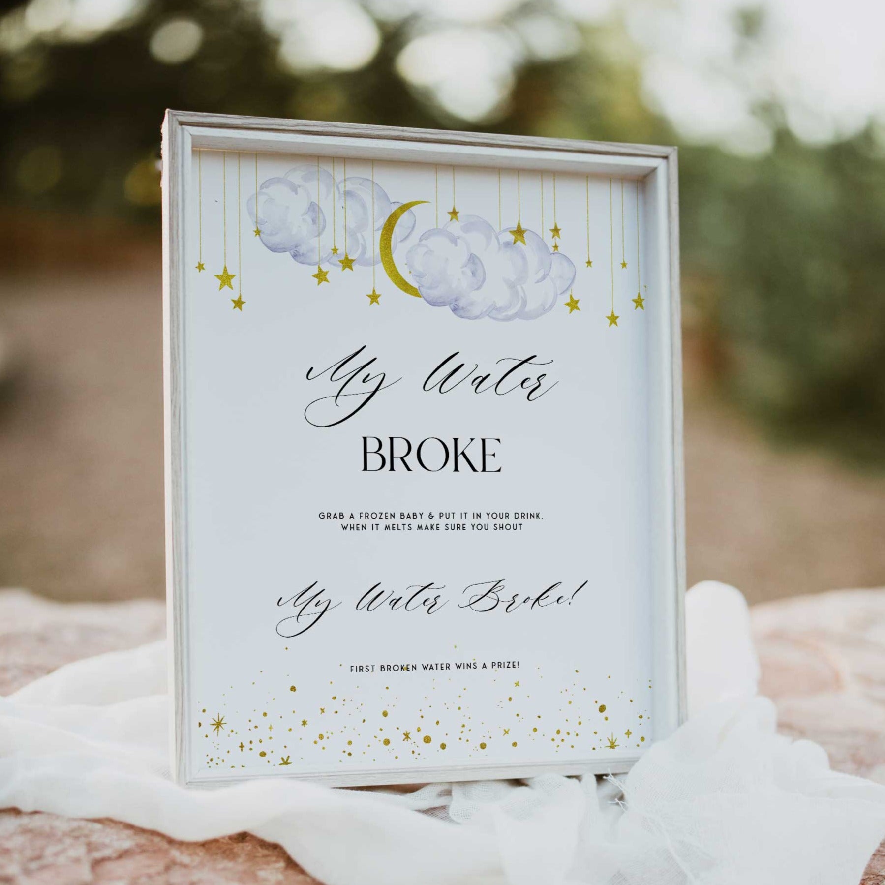 Fully editable and printable baby shower my water broke game with a little star design. Perfect for a Twinkle Little Star baby shower themed party